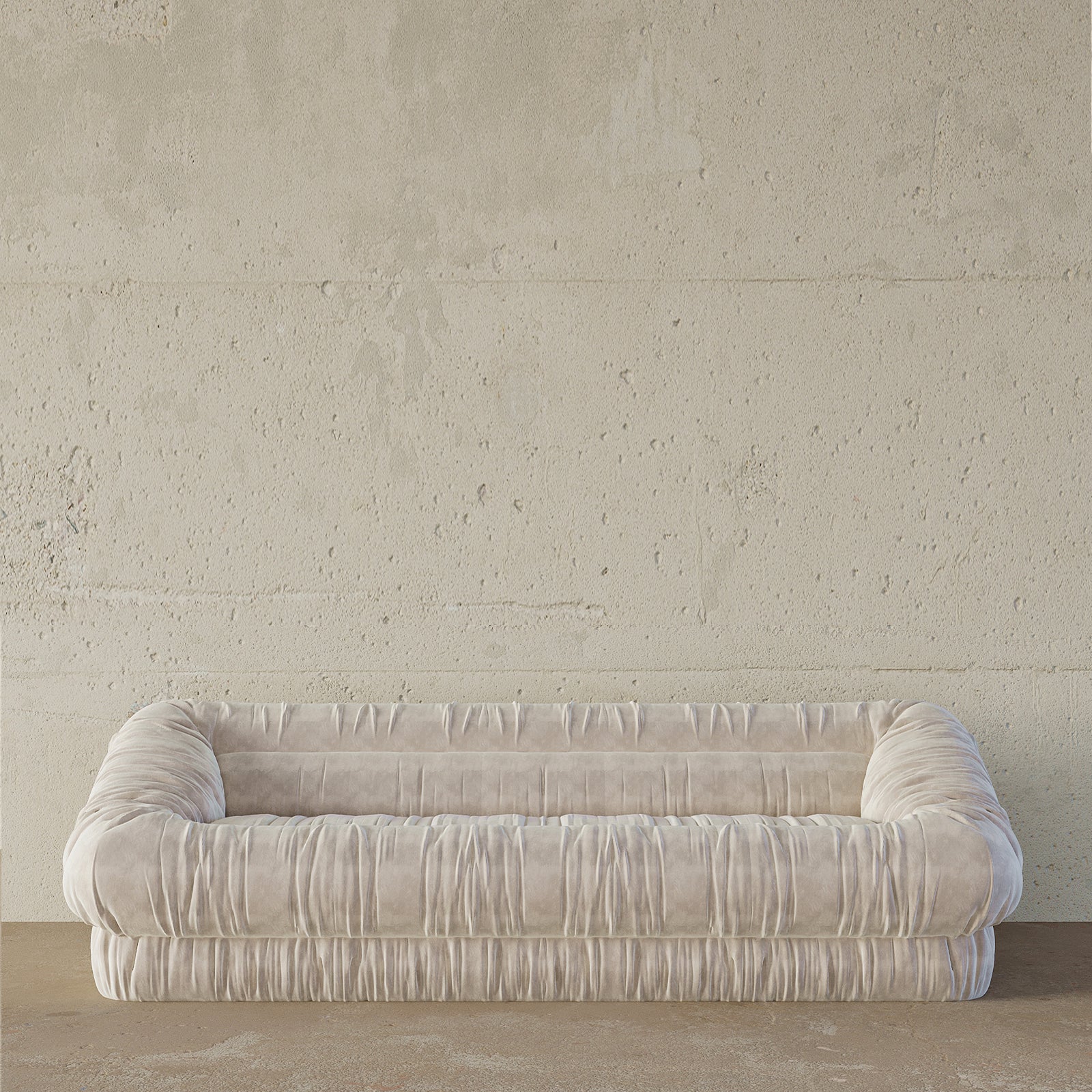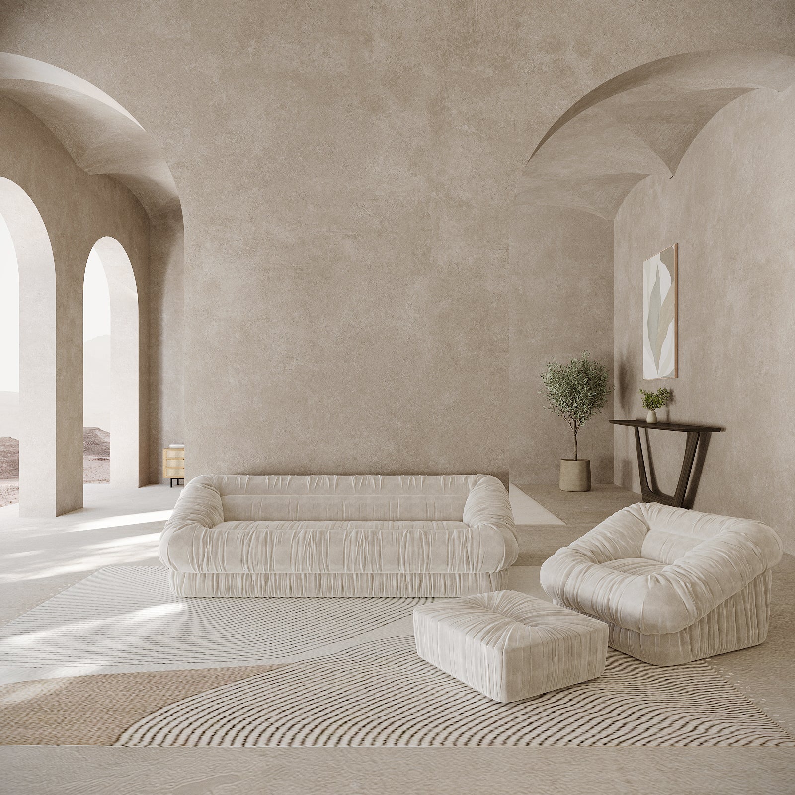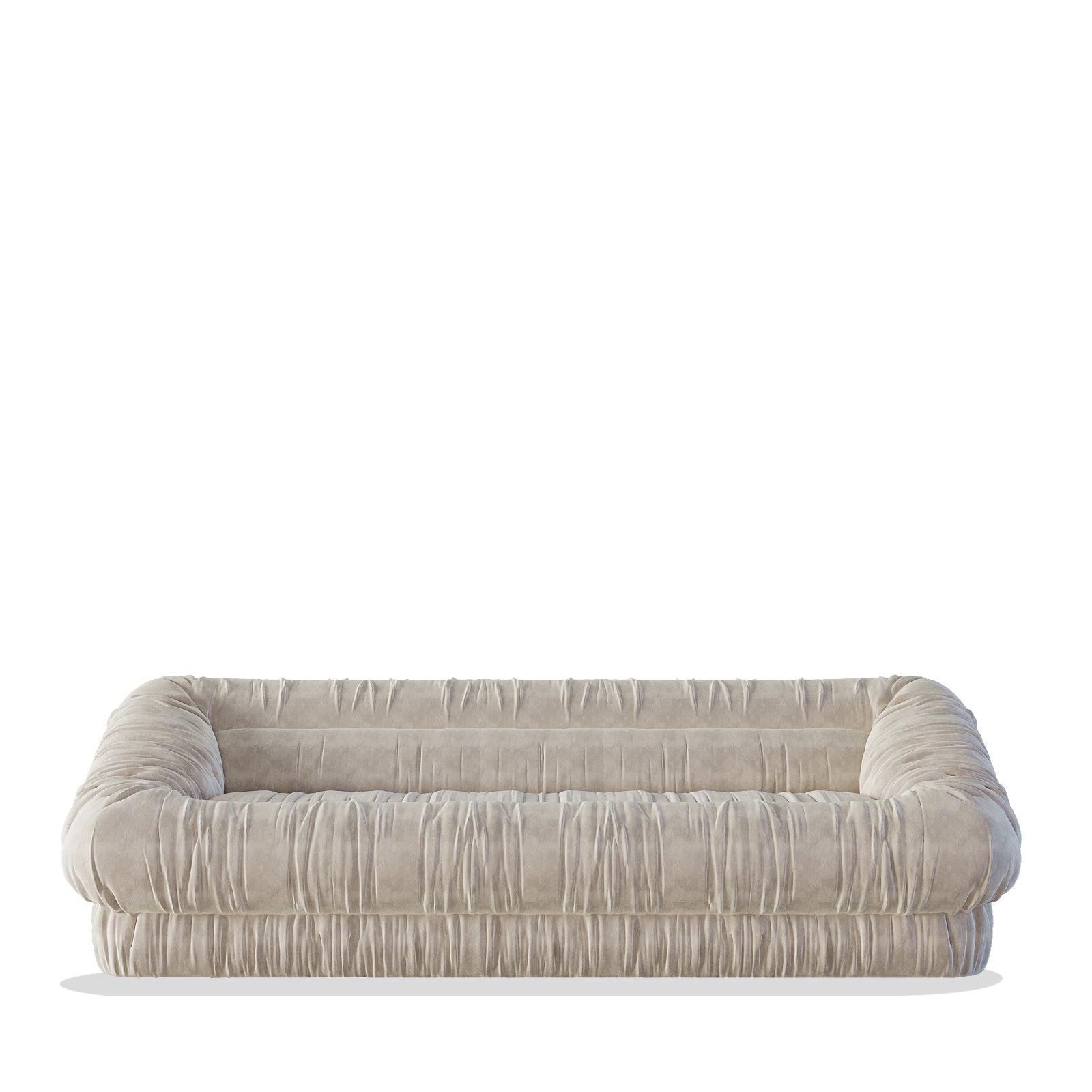 تتميز الأريكة Dune 3S بتصميمها الذي يتميز بتطريزات عمودية واسعة على كامل جسم الكنبة المصنوع من المخمل المخملي المخملي الأبيض الفاتح الذي يخلق شكلاً مستقيماً ضخماً وجذاباً مع مساند أذرع مبطنة بعمق ومدمجة وقاعدة كبيرة منخفضة.