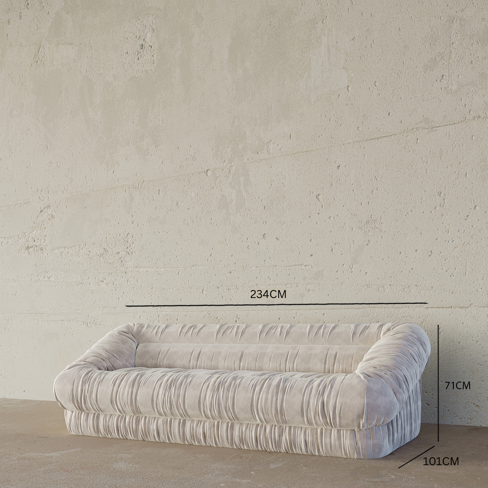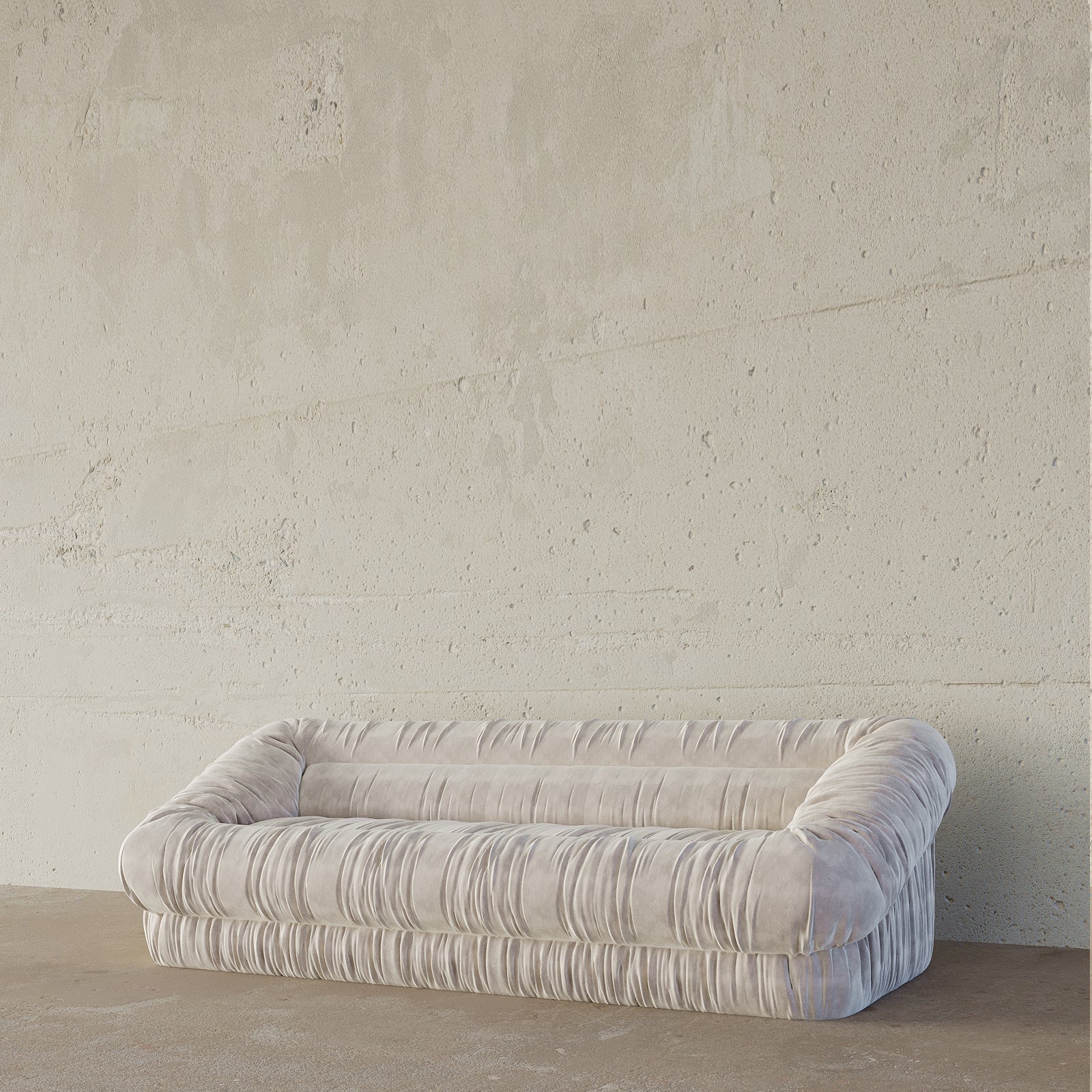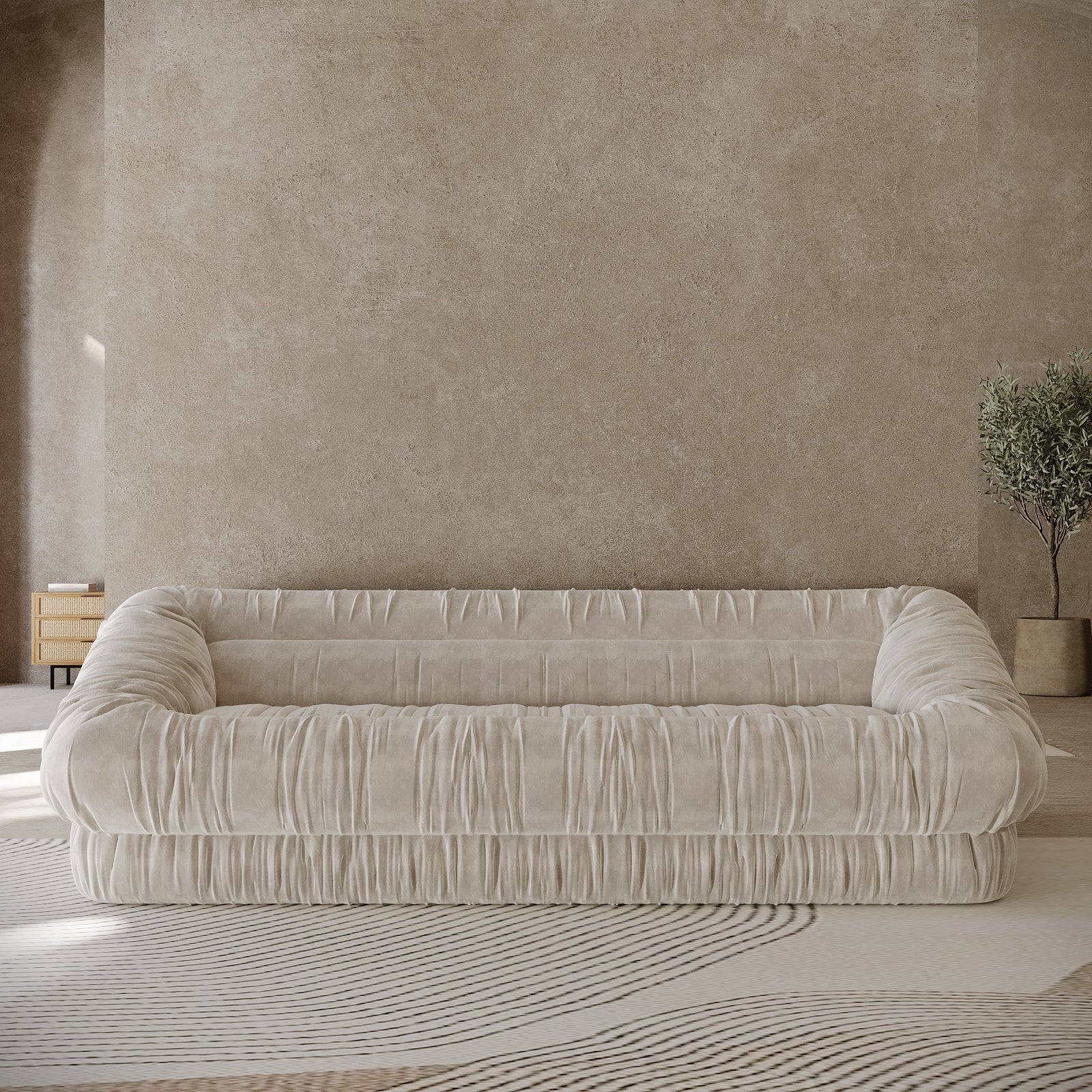 تتميز الأريكة Dune 3S بتصميمها الذي يتميز بتطريزات عمودية واسعة على كامل جسم الكنبة المصنوع من المخمل المخملي المخملي الأبيض الفاتح الذي يخلق شكلاً مستقيماً ضخماً وجذاباً مع مساند أذرع مبطنة بعمق ومدمجة وقاعدة كبيرة منخفضة.