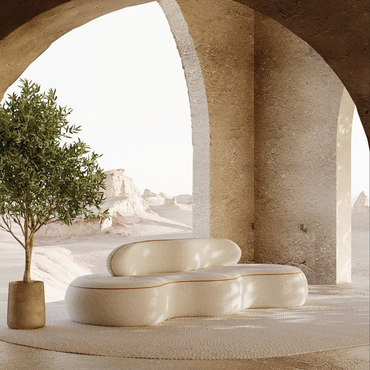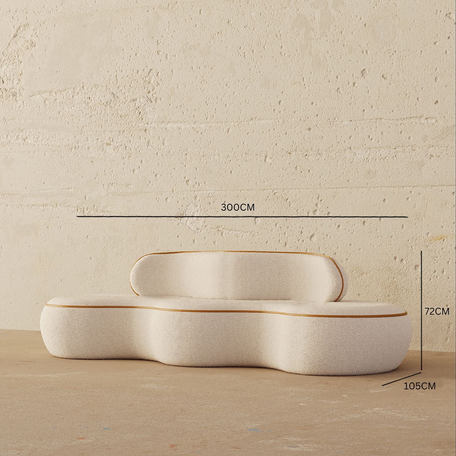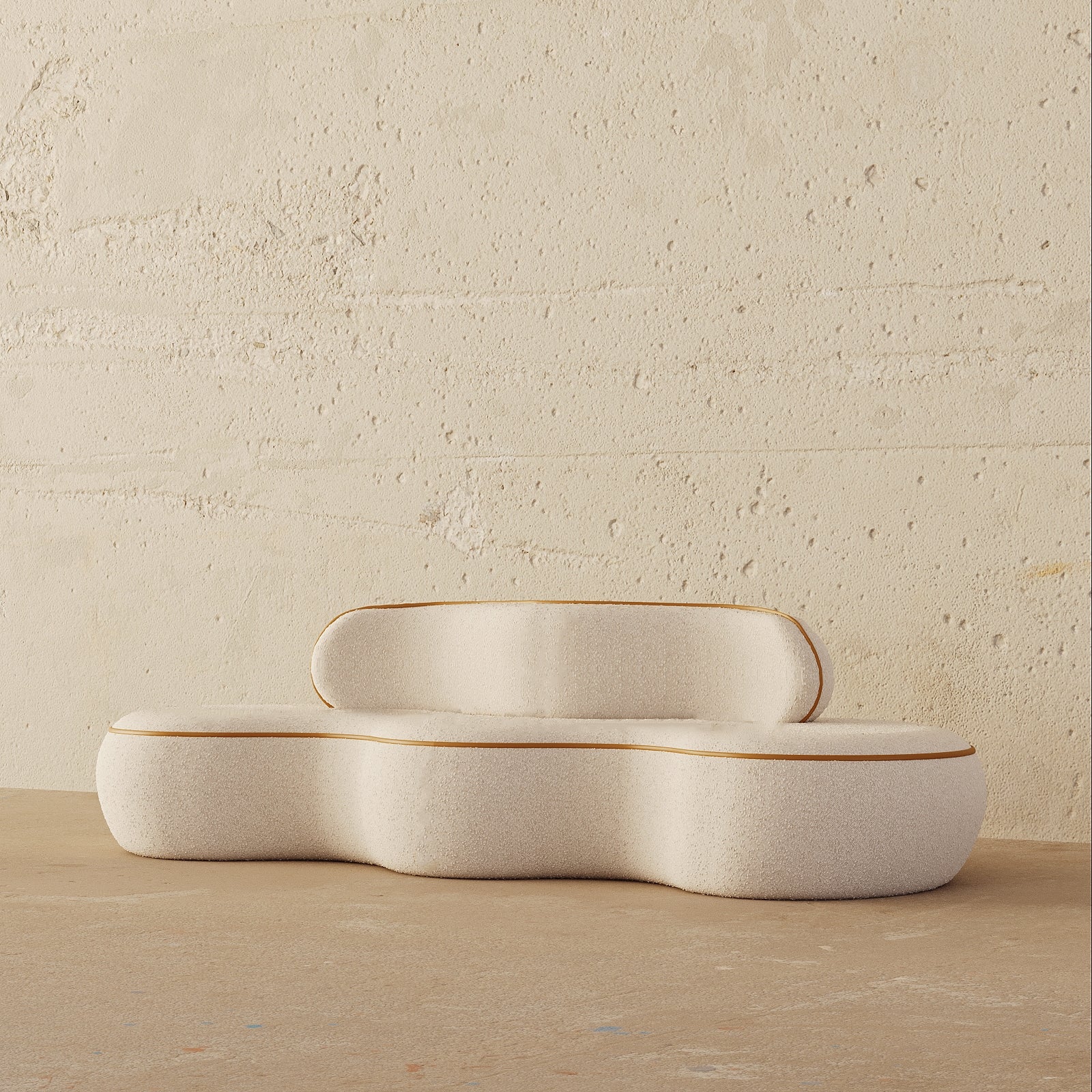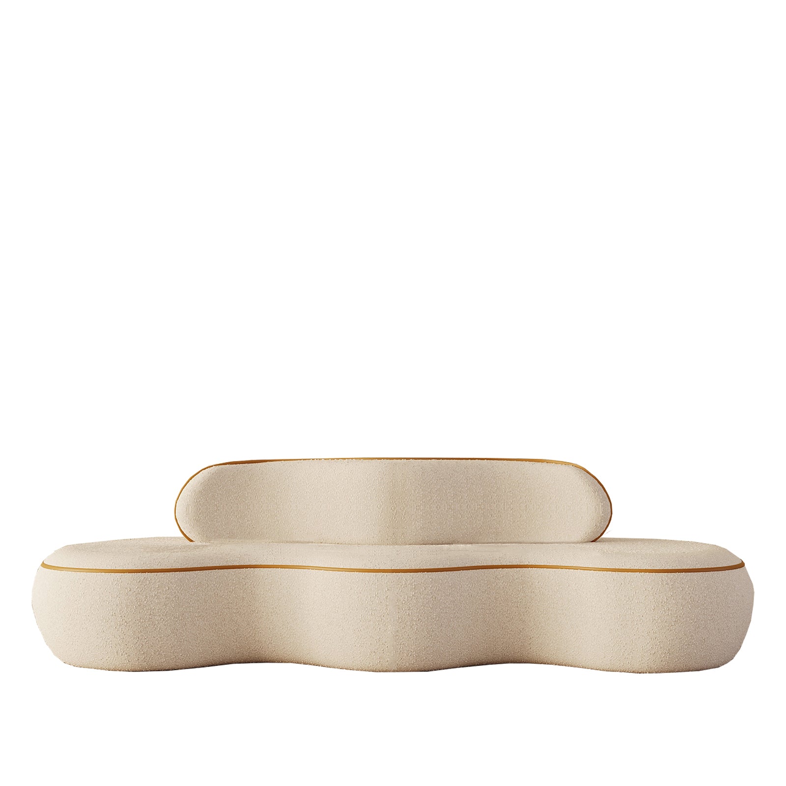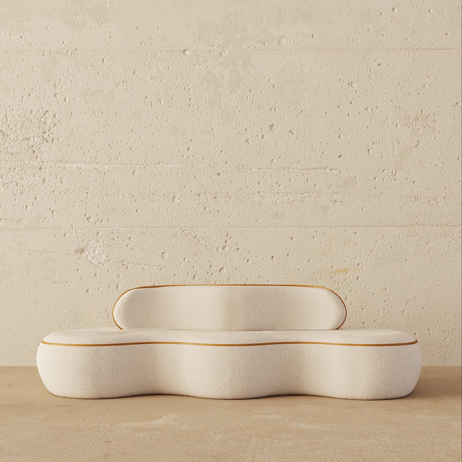 تتميز أريكة Oryx 3S بتصميمها الفريد المتموج المنجد بقماش بوكل فاتح اللون منجد بنسيج بوكل فاتح اللون، مما يضفي عليها لمسة جمالية ناعمة وجذابة، ويزيد من جمالها الزخارف المتباينة التي تحدد منحنياتها المميزة وتصميمها المنخفض.