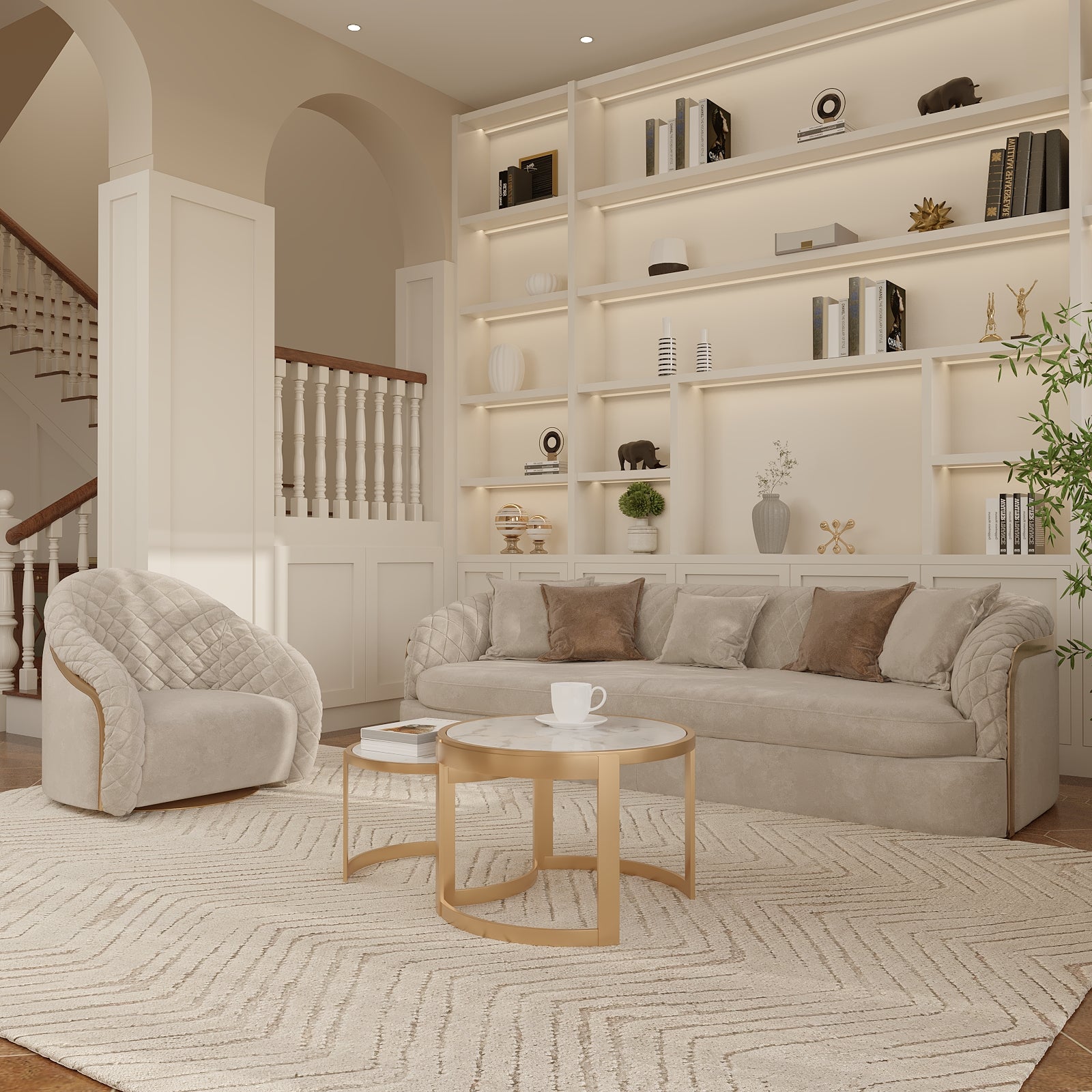 يُضفي طقم غرفة المعيشة Luna لمسة جريئة وساحرة على منزلك بقطع فاخرة تشمل أريكة قماشية وكرسي بذراعين وطاولة قهوة. يجمع هذا الطقم بين الأناقة الخالدة والأناقة العصرية، حيث ينضح هذا الطقم بالرقي والفخامة مع لمسات ذهبية وطاولات ذات سطح رخامي طبيعي. ارتقِ بغرفة جلوسك مع هذا الطقم المذهل والفاخر.