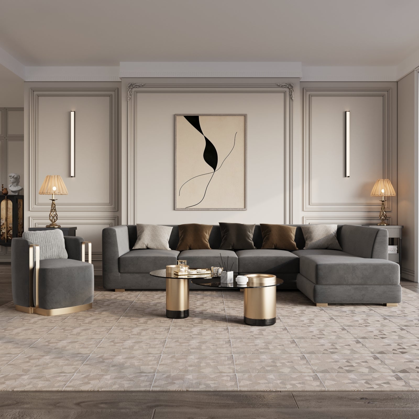 تألق بإطلالة مميزة مع طقم غرفة المعيشة Noir المتطور. تتميز هذه المجموعة المنتقاة بعناية بأريكة نموذجية وكرسي بذراعين وطاولة قهوة مذهلة ذات طبقتين مع سطح زجاجي مقوى وقاعدة من الفولاذ المقاوم للصدأ باللون الذهبي. متعدد الاستخدامات وجريء، ينضح بالأناقة المثيرة بمواده المتباينة وخطوطه الأنيقة. قم بإنشاء نقطة محورية جذابة بصرياً خاصة بك مع تكوينات مخصصة باستخدام الأريكة المعيارية.