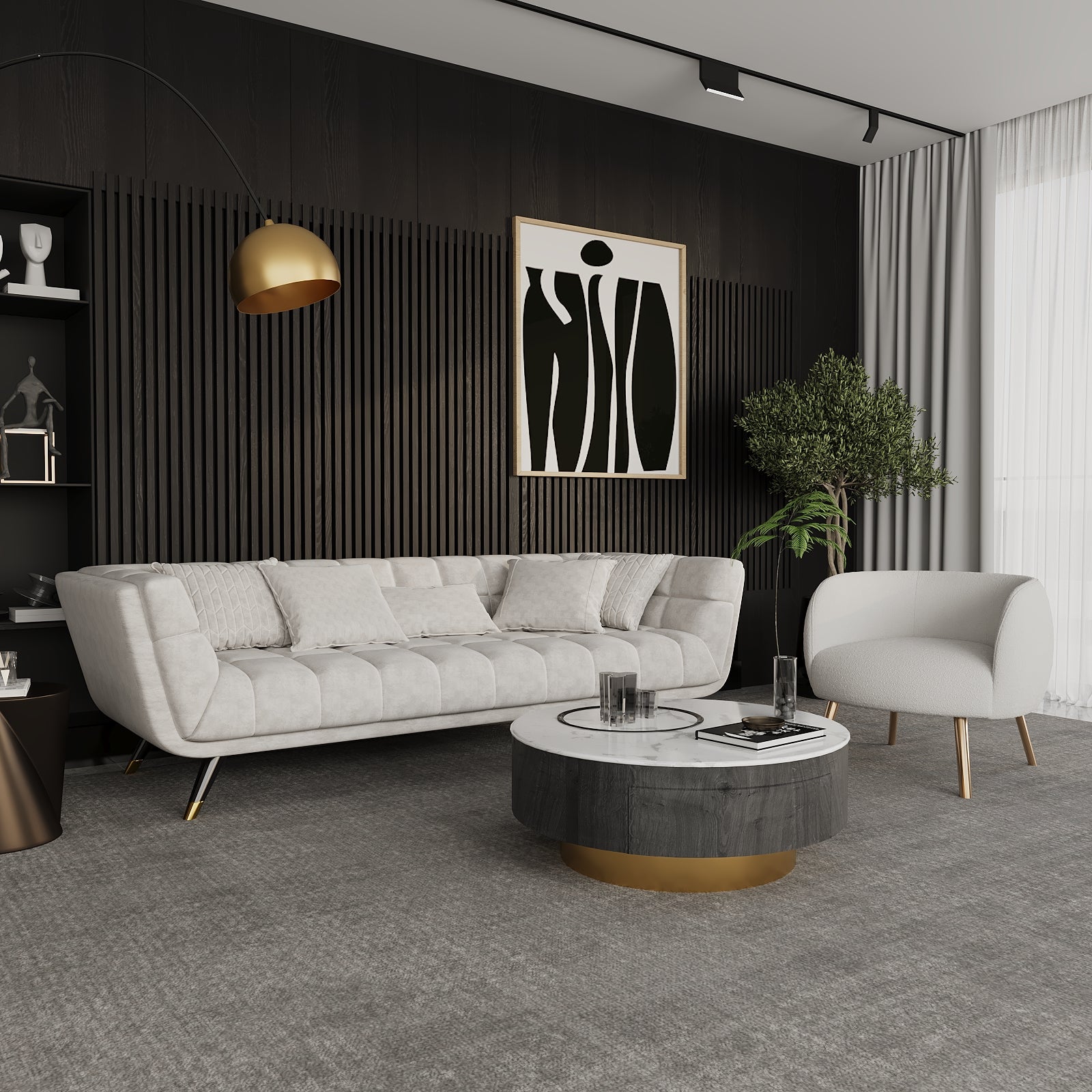يتميز طقم غرفة المعيشة صن ستون بأناقة عصرية وراحة راقية. أريكة فخمة وكرسي بذراعين منجدة بقماش أبيض فاخر من مزيج الصوف الأبيض، وتكتمل أناقتها بطاولة قهوة أنيقة مع مساحة تخزين واسعة. صُمم طقم Sunstone ليضفي أجواءً راقية على غرفة المعيشة، حيث يوازن بين الأناقة والعملية مع خطوط أنيقة وألوان محايدة تضفي جواً هادئاً. خامات عالية الجودة وحرفية دقيقة تضمن جمالاً وراحة دائمين.