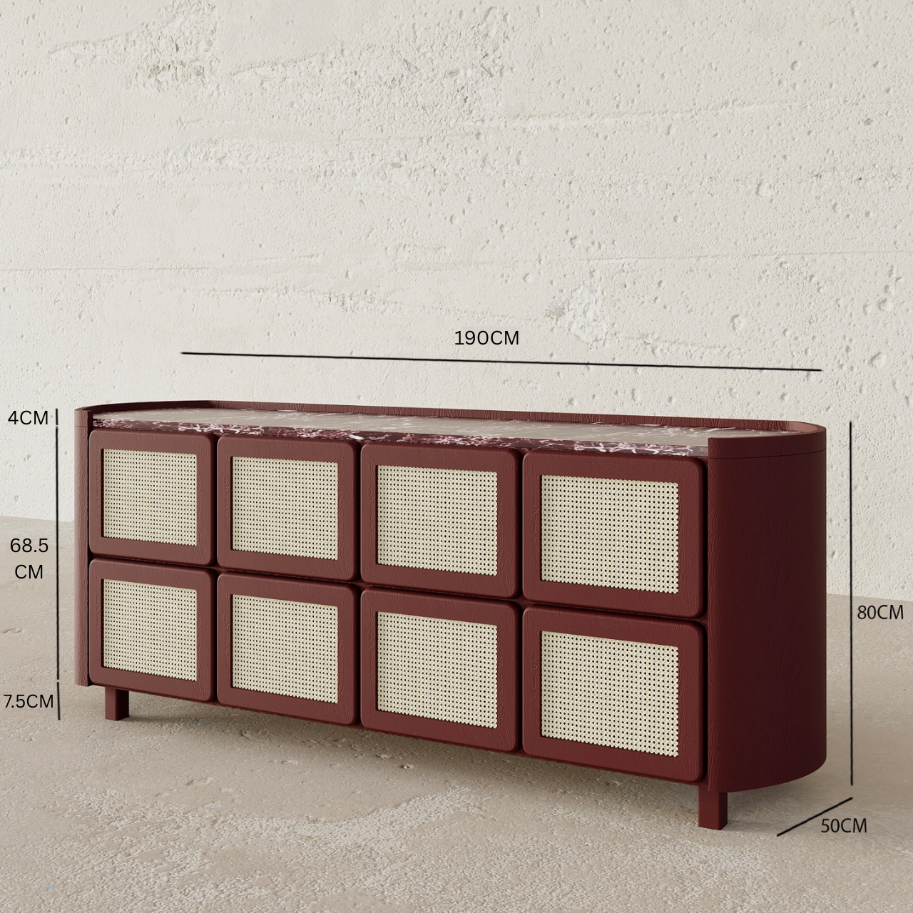 ارتقِ بمساحتك مع بوفيه Samuel بوفيه Samuel، وهو مزيج راقٍ من الفخامة والعملية. إطاره باللون العنابي الغامق مغطى بسطح رخامي مدهش يتباين مع أبواب الخزانة المنسوجة من الروطان لإضفاء مزيد من الملمس. زوايا مستديرة ومساحة تخزين واسعة تجعله أنيقاً وعملياً في نفس الوقت، حيث يتناسب بسلاسة مع الممرات أو غرف الجلوس أو أماكن تناول الطعام. تعتبر خزانة صامويل كونسول حلاً أنيقاً لحياة منظمة وراقية.