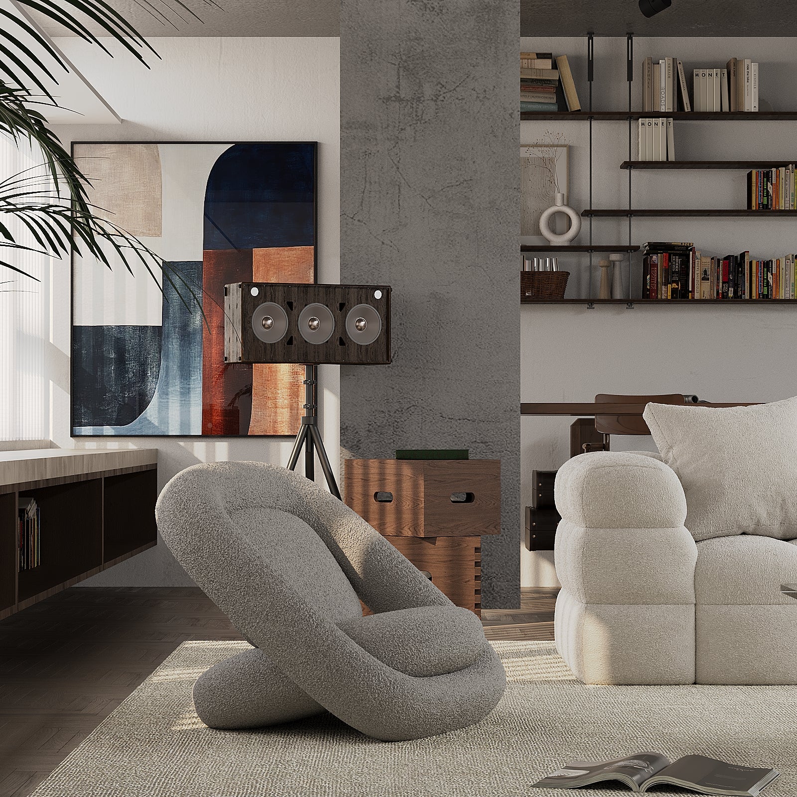 يعتبر كرسي ستيفان إضافة عصرية وفنية لأي مساحة. يتميز بنسيج بوكل رمادي ناعم وملمس ناعم، مما يضفي جاذبية بصرية ولمسية في آن واحد. كما أن شكله العضوي يخلق تجربة جلوس مريحة، في حين أن تصميمه الفريد يجعله مميزاً في أي غرفة. مثالي لمن يريد قطعة مميزة تجمع بين الراحة والأناقة العصرية.