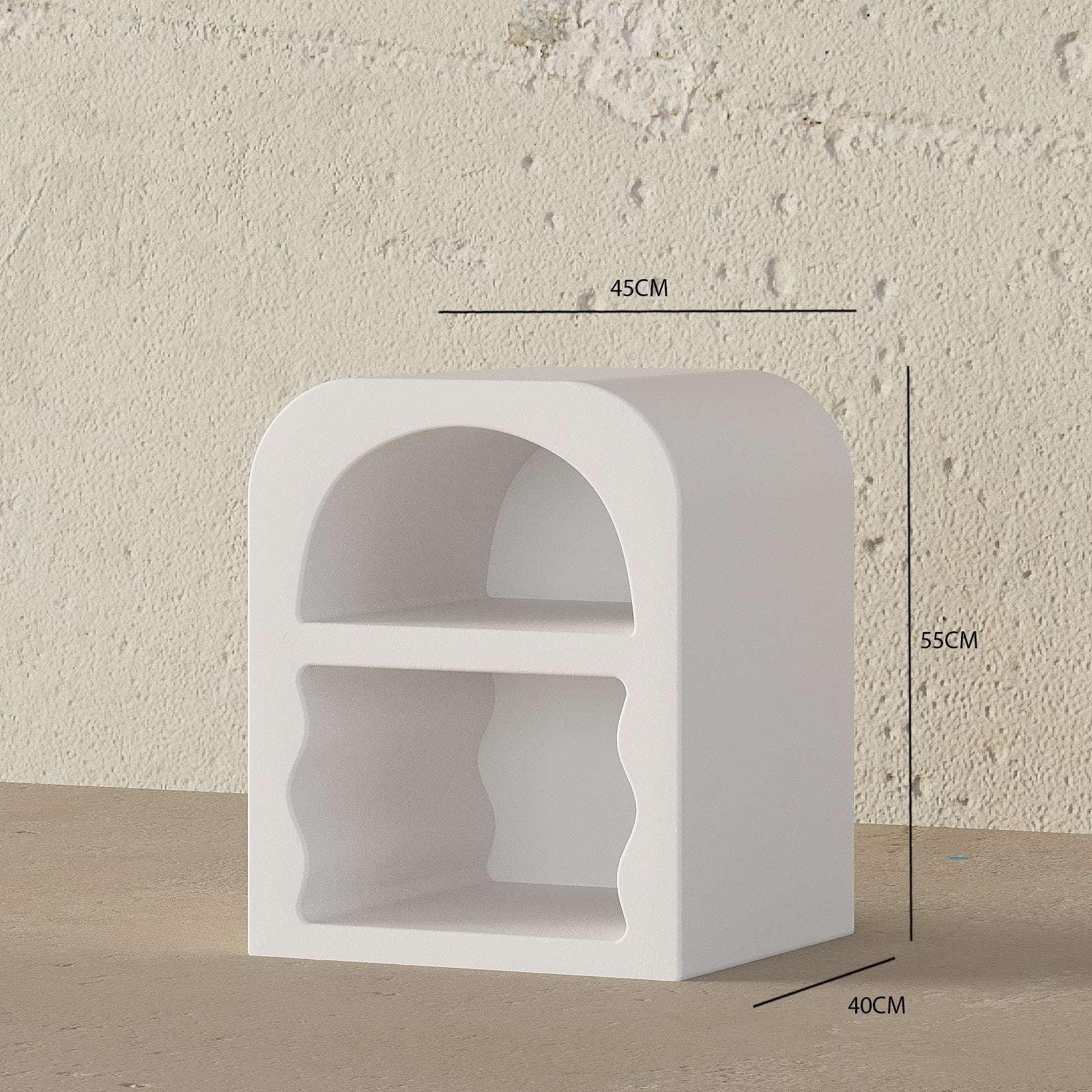 Introducing the Callie Art Deco Nightstand - a sophisticated and functional addition to any room. With two open shelves, it provides ample storage and doubles as a display piece. The heightened sidewall prevents dust buildup, ensuring easy maintenance. Its geometric aesthetics and arched top make it a stylish statement in any space.