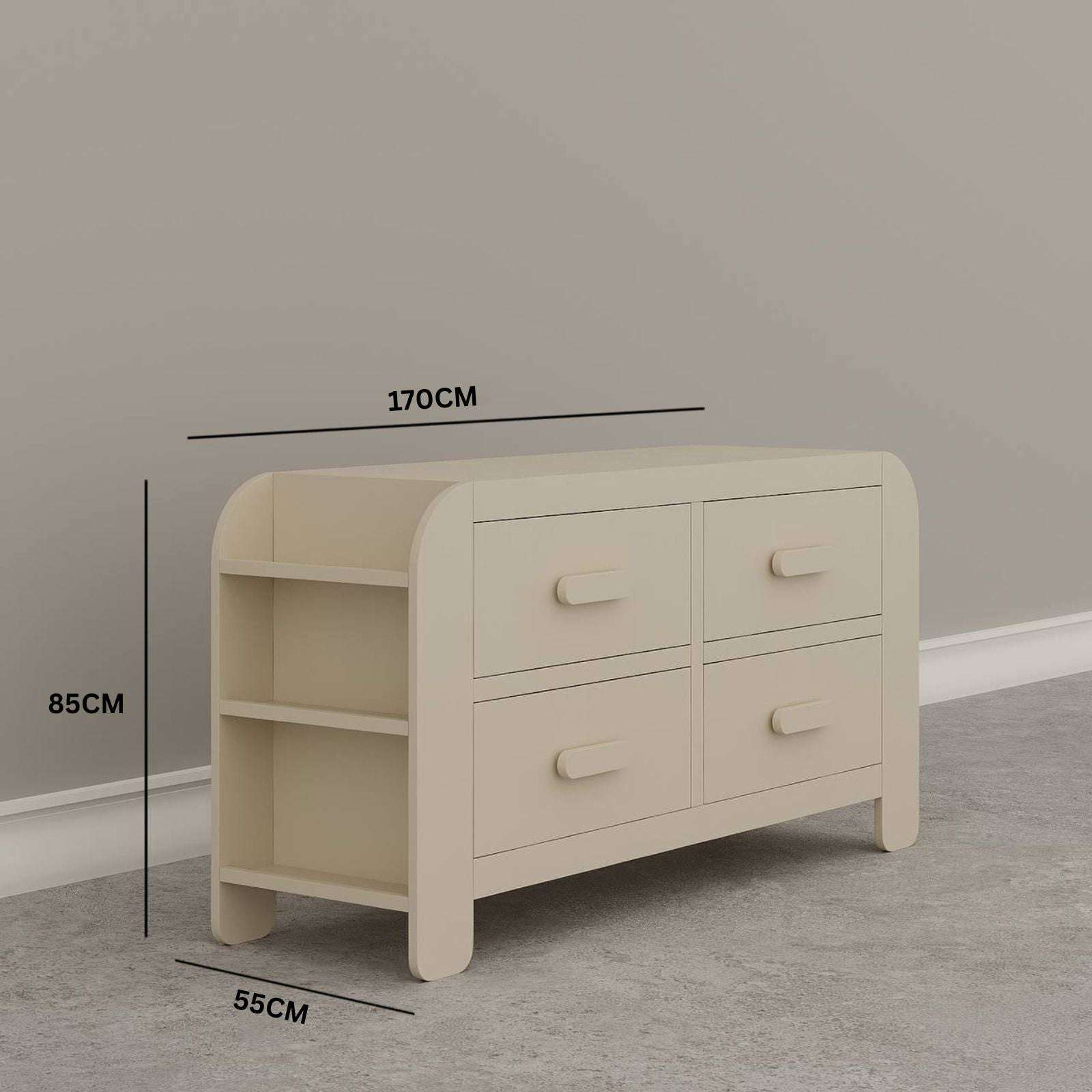 Introducing the Claudio Dresser, a modern piece in elegant matt beige. With four drawers and three shelves on each side, this dresser maximizes space and allows for easy organization of your accessories. Perfect for any modern room, experience both functionality and style with Claudio.