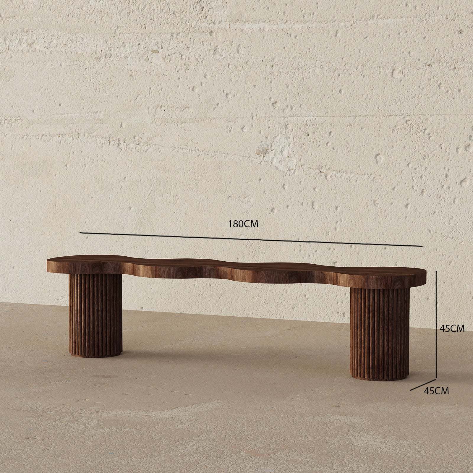 The Grove Bench is a sculptural statement piece that seamlessly blends organic forms with modern design. Its distinctively wavy, undulating top, crafted from wood, rests elegantly upon two sturdy, fluted cylindrical bases. This unique combination creates an inviting focal point, bringing natural elegance and contemporary style to any living space, perfect for hallways, entryways, or as additional seating.