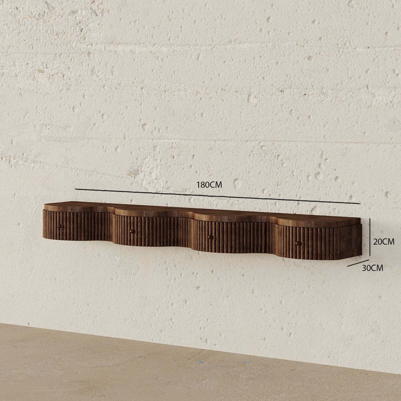 The Grove Hanging Console is a sculptural and functional wall-mounted piece. It features the signature wavy, undulating front and vertical fluting of the Grove collection, providing concealed storage while adding a modern, artistic touch to any space. Its hanging design saves floor space, contributing to a clean and contemporary aesthetic.