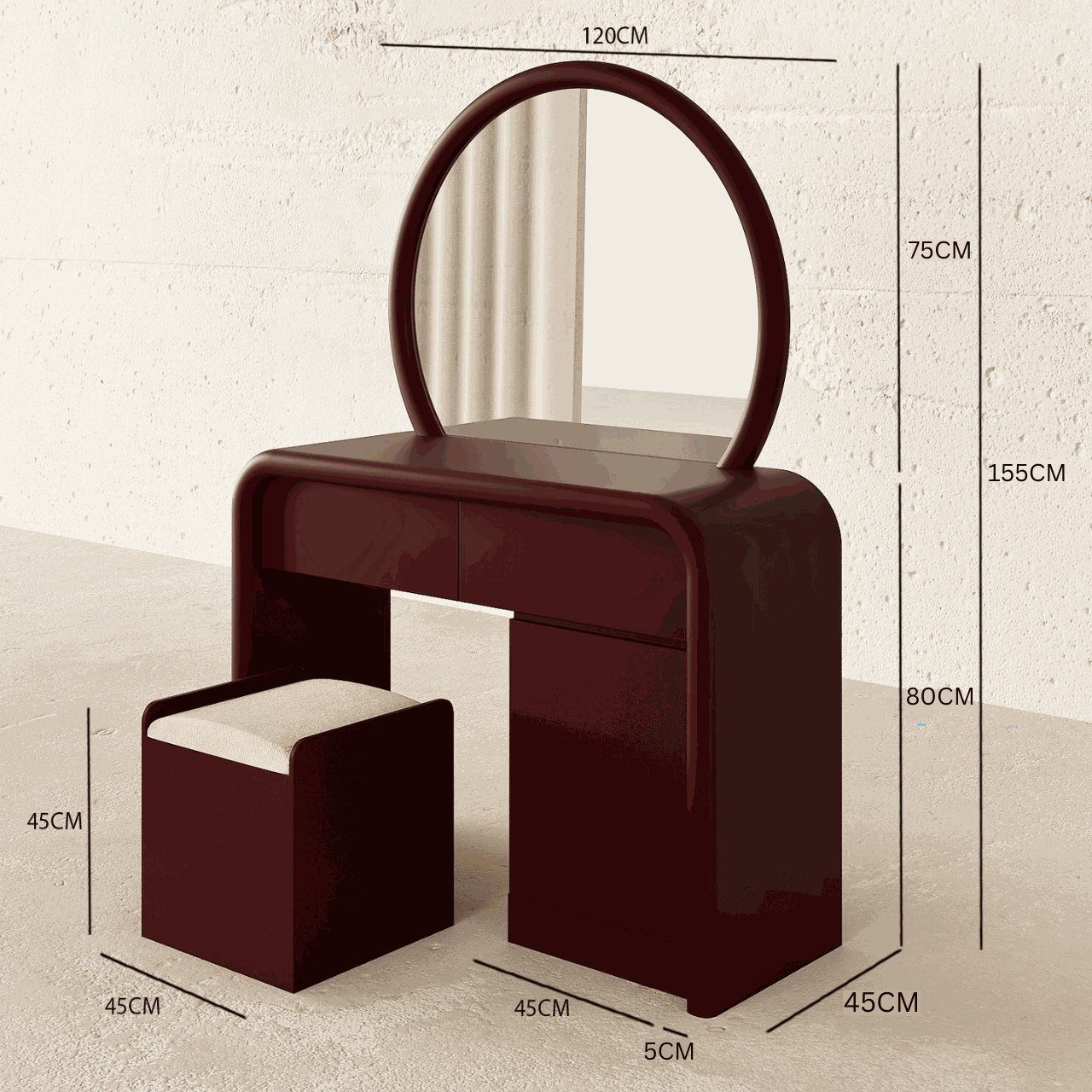 The Jenny Make-Up Vanity is a luxurious and functional piece for any bedroom or dressing area. With a deep finish and a rounded-edge design, this sleek vanity exudes elegance and sophistication. It features a large circular mirror and spacious drawers for optimal organization, while the matching stool with a cushioned seat adds to the clean and compact setup.