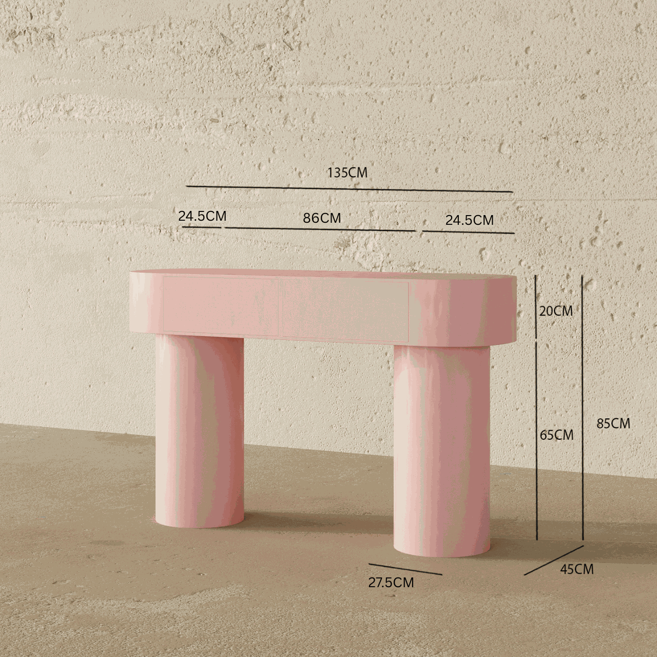 The Jinx Makeup Vanity is a stylish and functional addition to any bedroom or dressing area. Featuring a playful baby pink finish and a unique cylindrical base, this vanity adds a touch of personality to your space.
