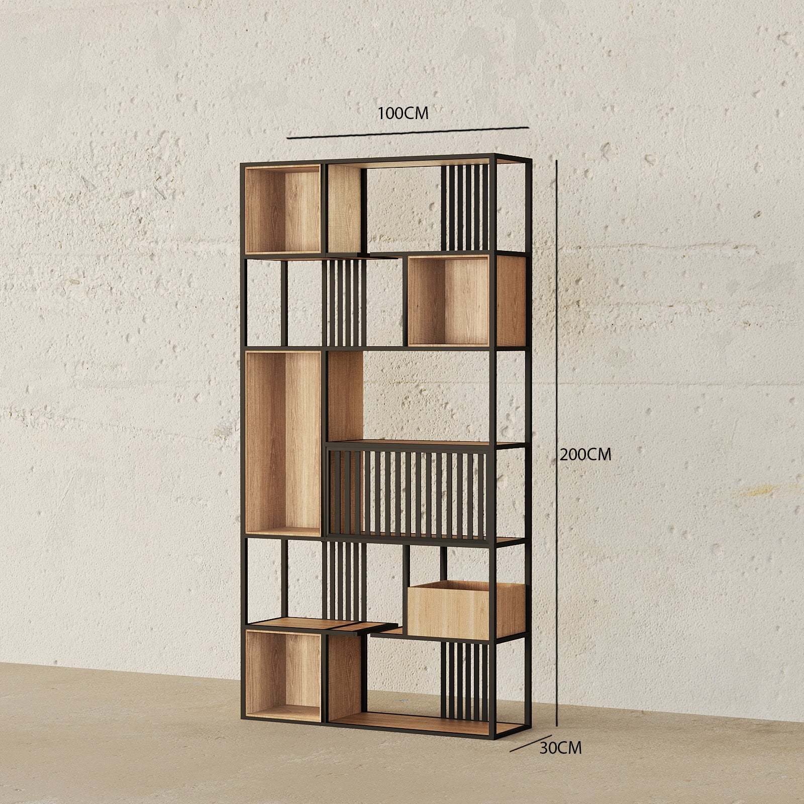 The Madence Shelving Unit combines a robust metal frame with MDF boards, creating a rustic industrial design that suits various home interiors. Its geometric style provides both visual appeal and functional storage for books, decor, and keepsakes. With a double-wide 6-tier structure and open back panel, it offers ample space for display while maintaining an airy look.