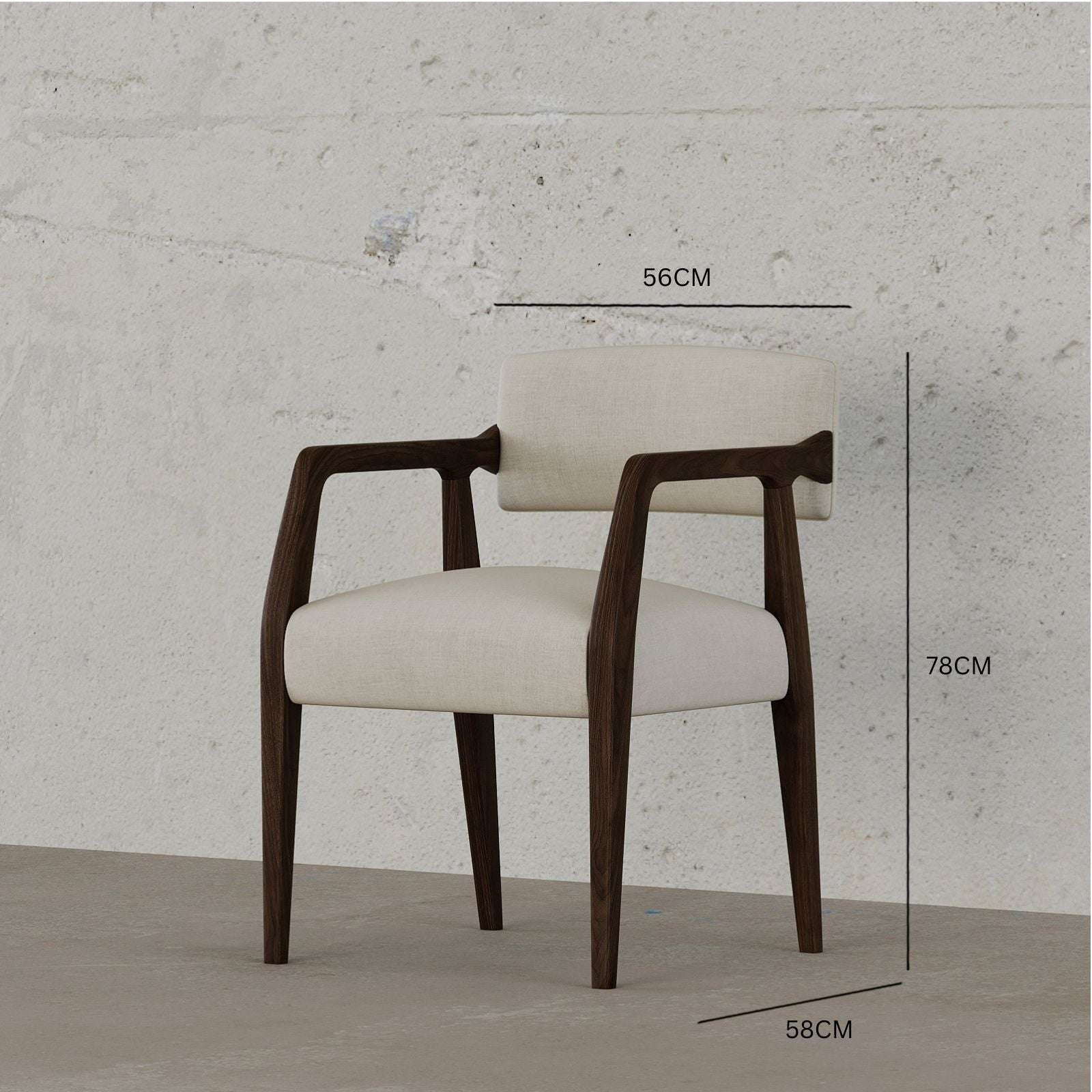 The Nexus Dining Armchair combines modern style with comfort. Its sturdy distressed walnut frame and soft cotton blend upholstery create a cozy and stylish seat for your dining area.