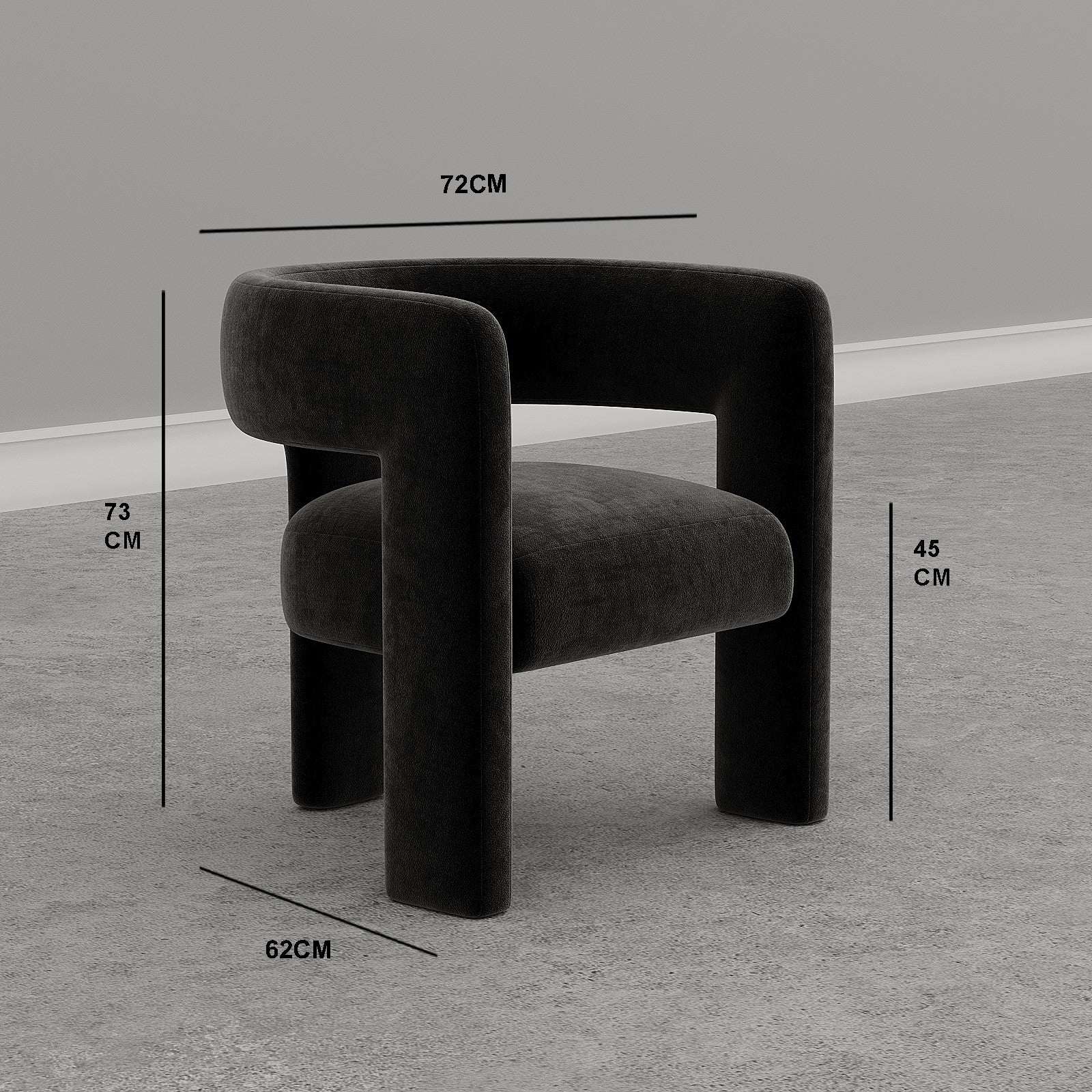 Indulge in luxury with the Gemma Armchair in premium velvet. Its sleek design features three legs and a curved backrest, forming a U-shape for ultimate comfort and elegance. Elevate any modern living room with this sophisticated and exclusive piece.