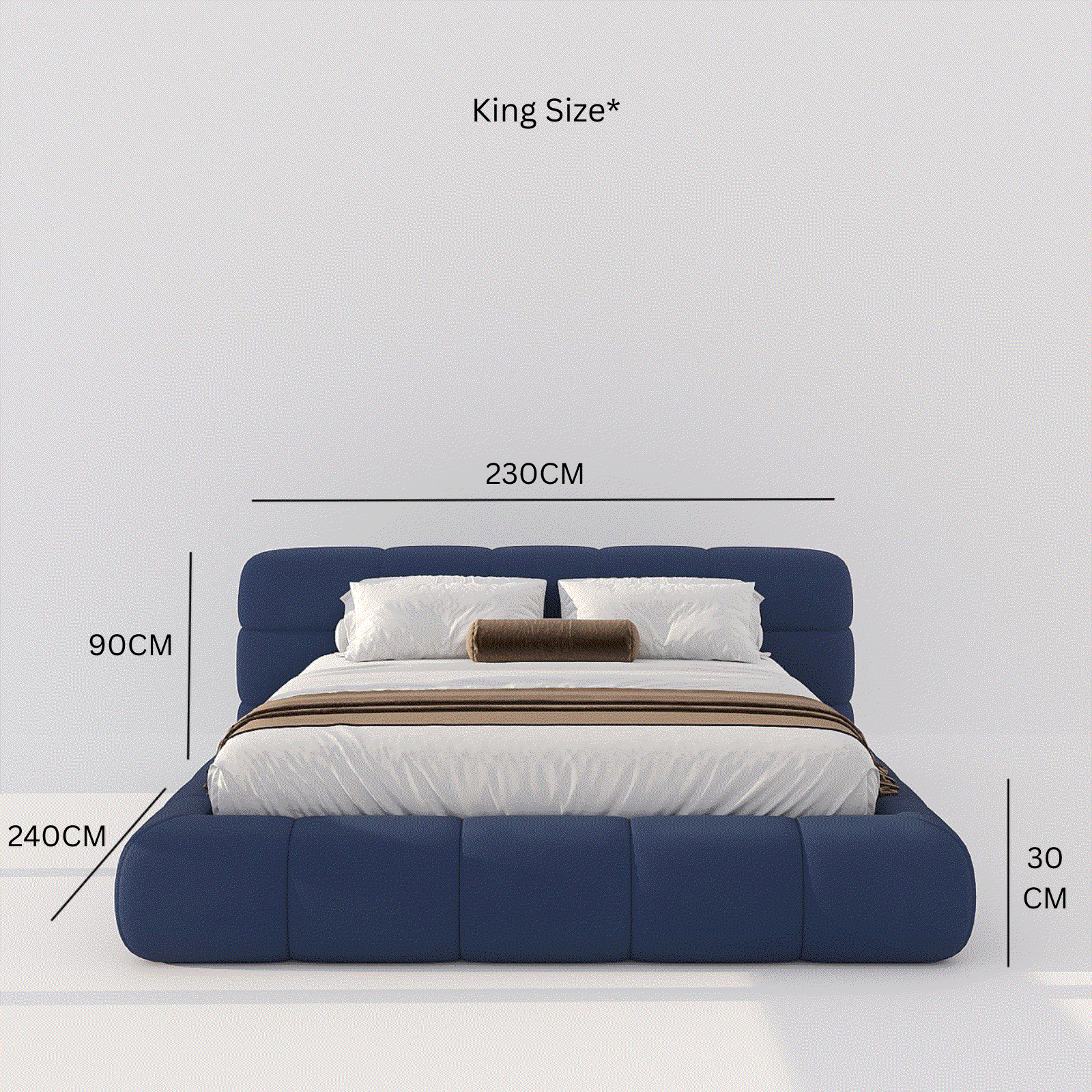 - King Bed : 230 W x 240 D x 90 H CM