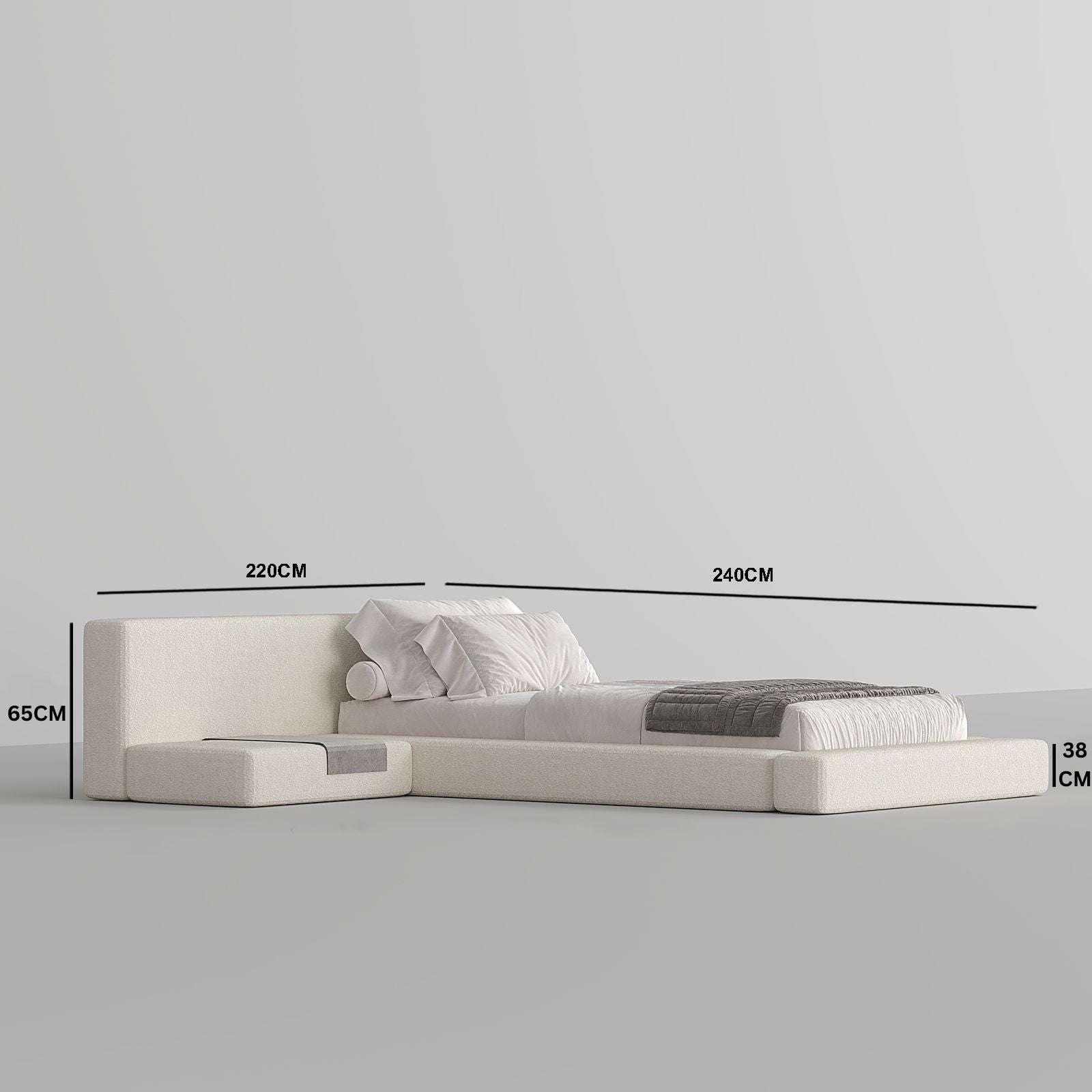 Indulge in the luxurious modern design of the Rico Bed with Night Stand in premium white & off-white boucle. This exclusive bed boasts a low height and headboard for ultimate comfort. The connected nightstand adds to its sophisticated appeal.