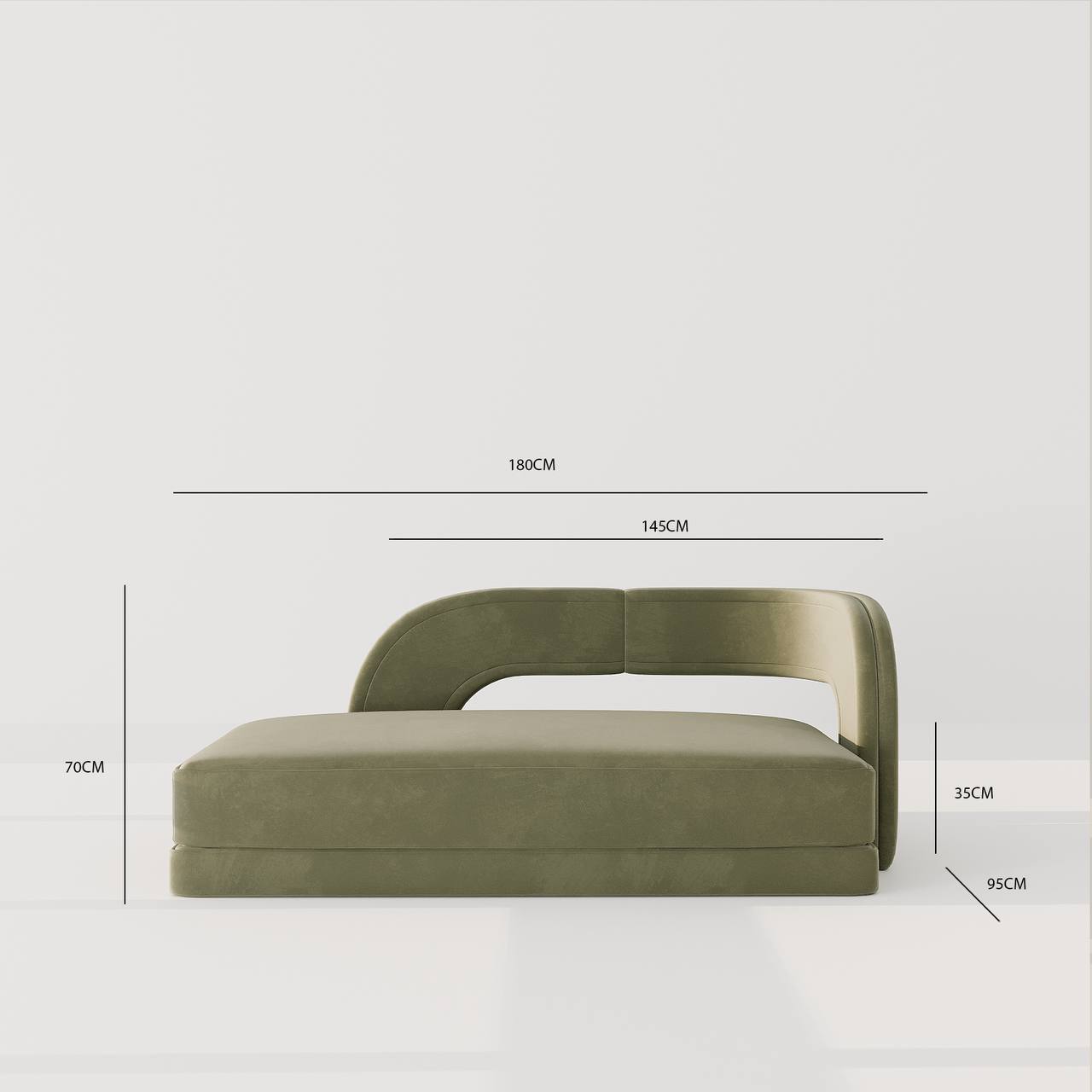 Experience luxury and sophistication with our Bondi Chaise in premium olive suede. Featuring a modern design with an open and curved backrest, sturdy base, and upholstered suede, this chaise is perfect for any modern space. Available in both right or left orientation for added flexibility. Elevate your space with this elegant and exclusive chaise.