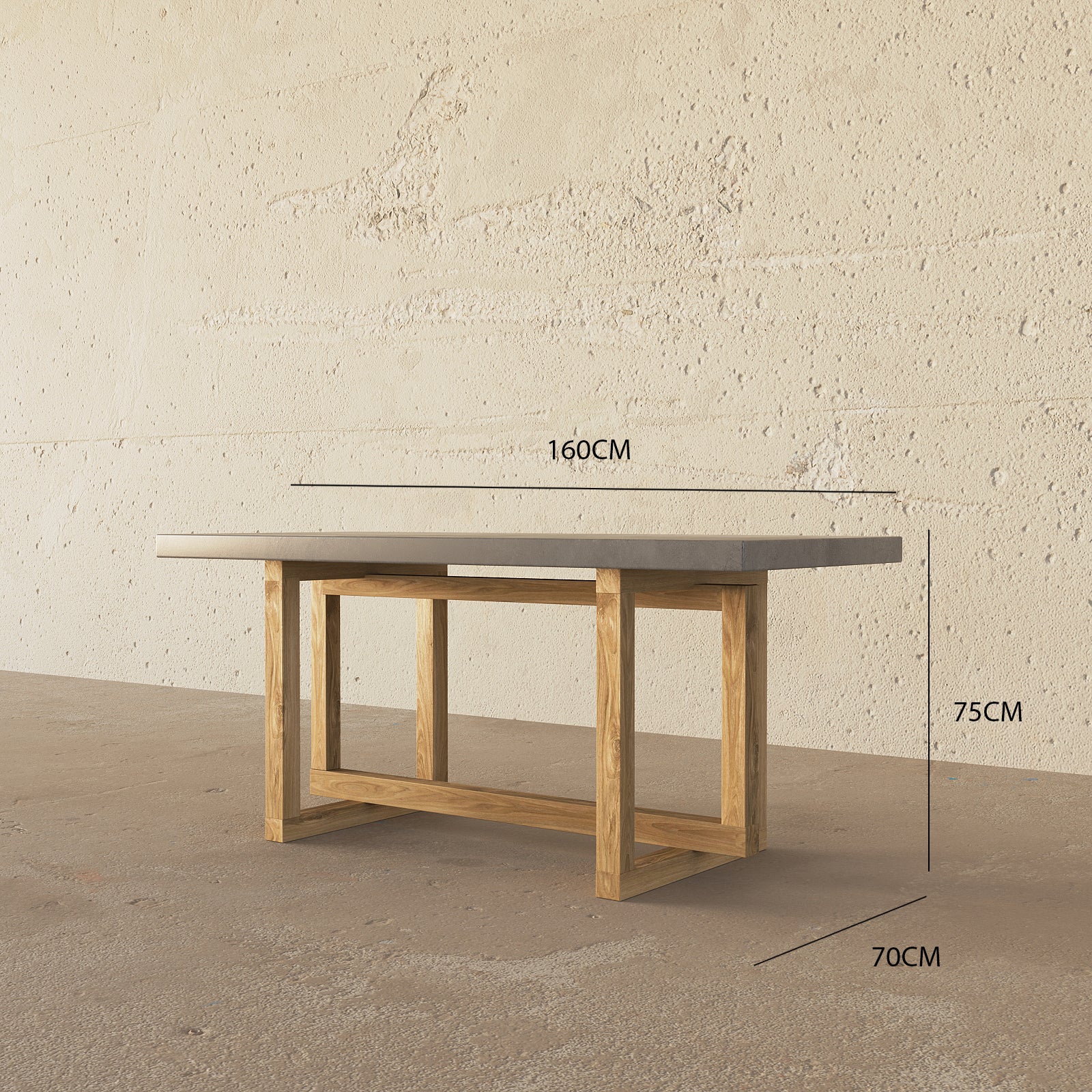 The natural environment is mixed with industrial chic. The contrast between the tempting surface of the concrete finish and the trendy crossing legs defines this dining table.