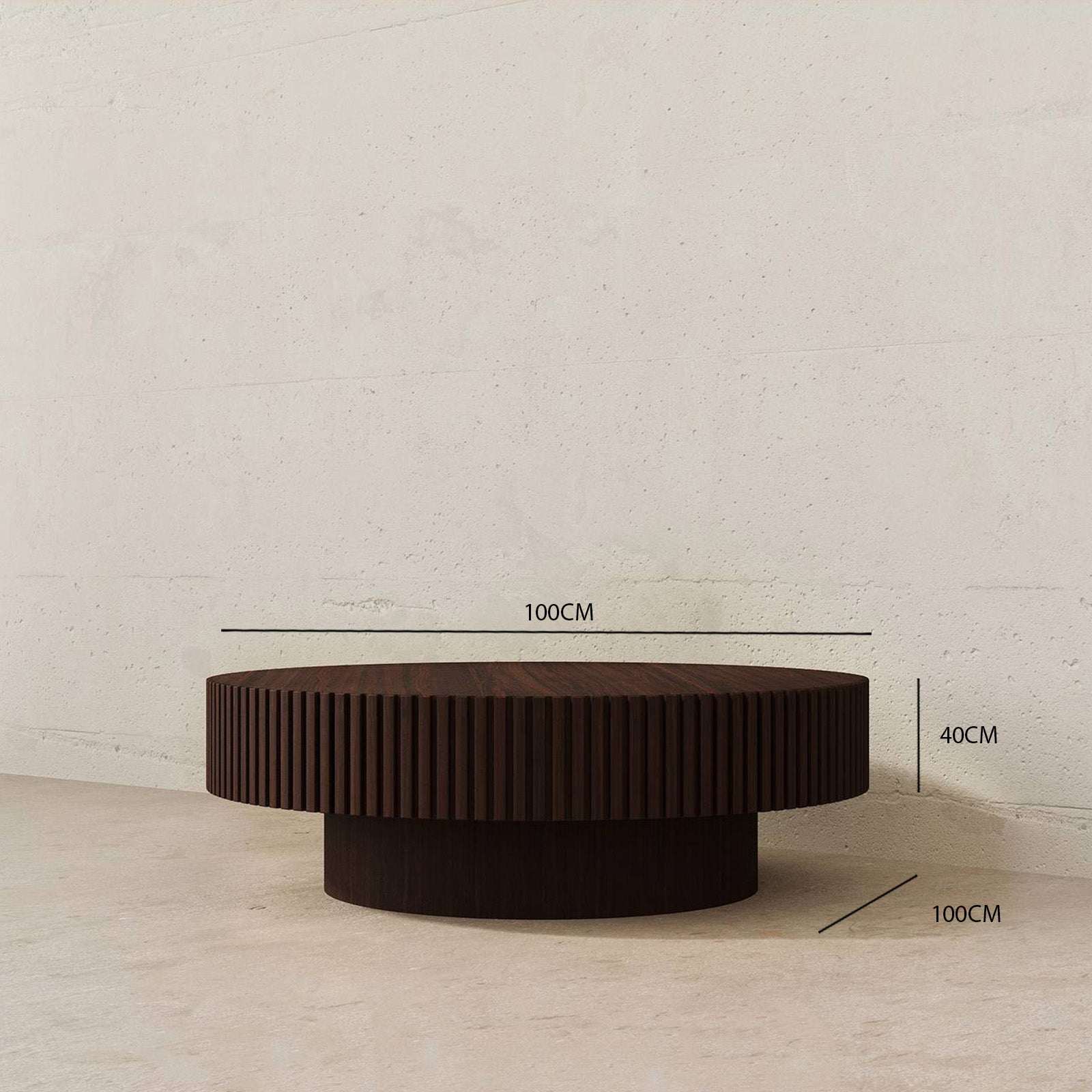 The Centura Coffee Table is a sculptural and modern piece that serves as a captivating focal point in any living area. Crafted from rich walnut wood, it features a distinctive circular top with finely ridged edges, adding tactile interest and a unique visual texture. The robust cylindrical pedestal base ensures stability while maintaining a sleek, contemporary silhouette.