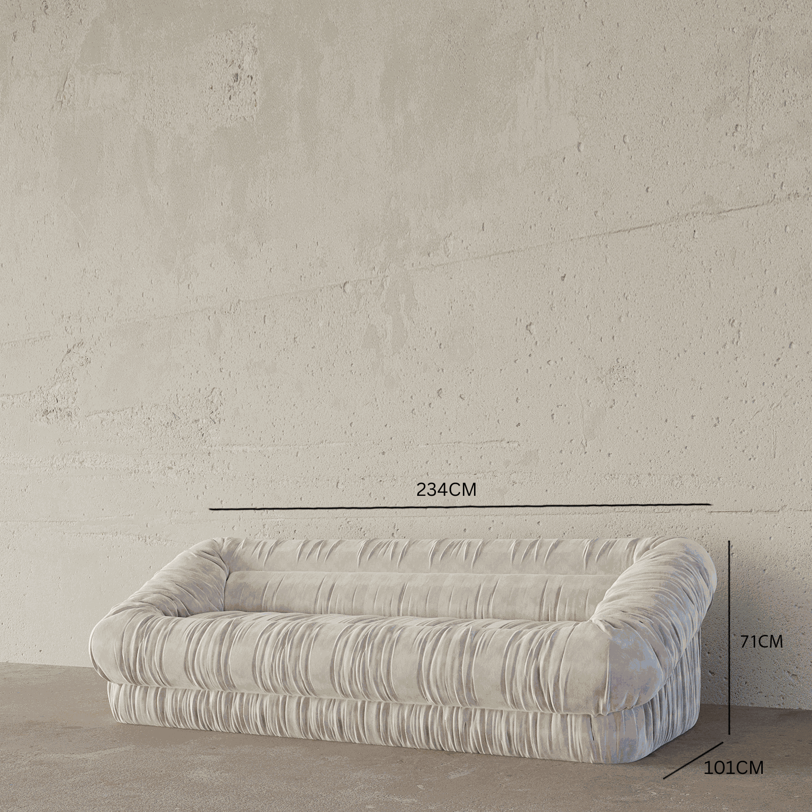 The Dune 3S Sofa is characterized by its extensive vertical ruching across the entire body, crafted from a plush, off-white velvet, which creates a voluminous and inviting rectilinear form with deeply padded, integrated armrests and a substantial, low-profile base.