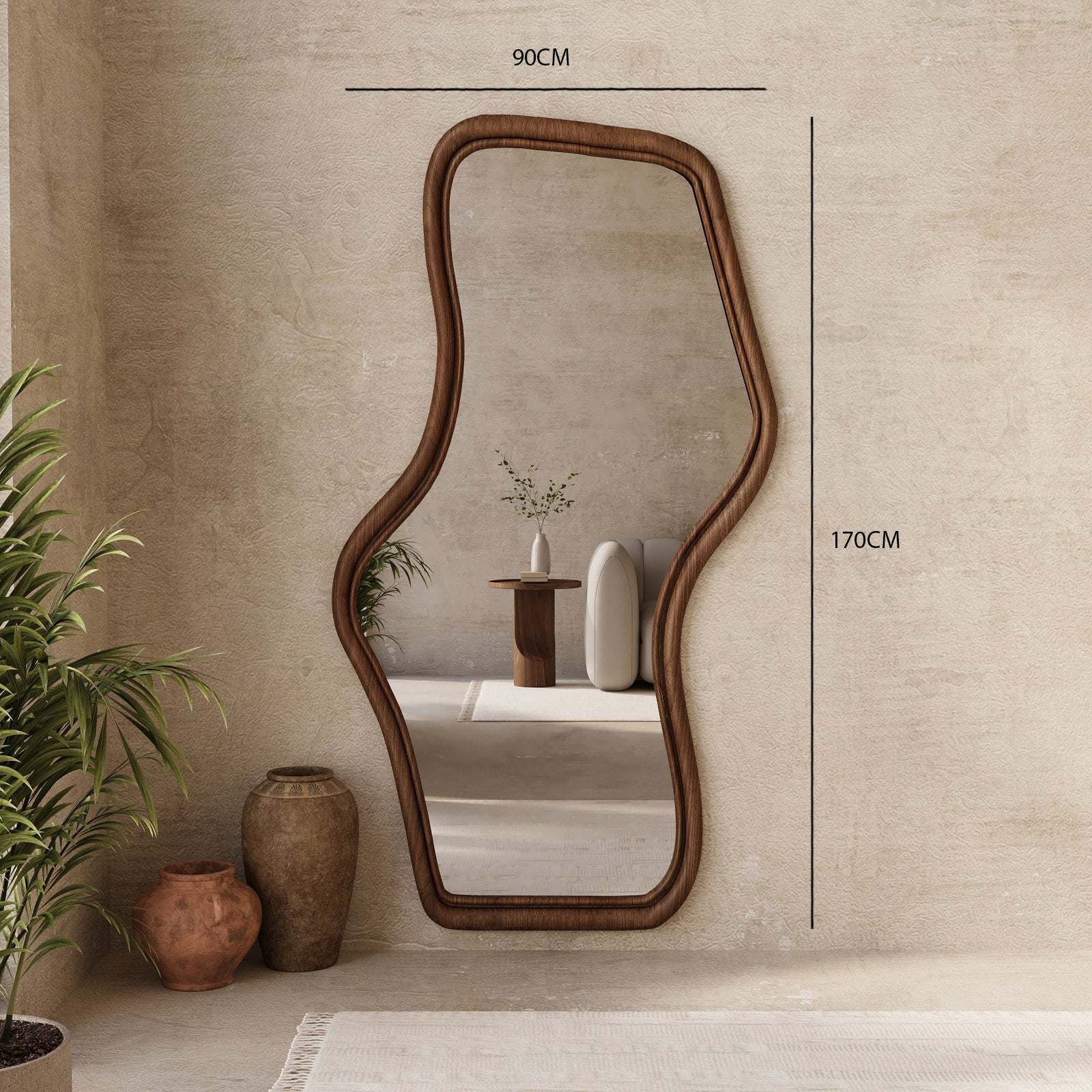 The Parla Mirror is a striking and contemporary piece, distinguished by its unique irregular shape. This long mirror provides a full-length reflection, making it both a practical and artistic addition to any space. Its distinct silhouette is framed by smooth, curved edges crafted from MDF with a sophisticated walnut finish, offering a refined touch that complements its unconventional form.