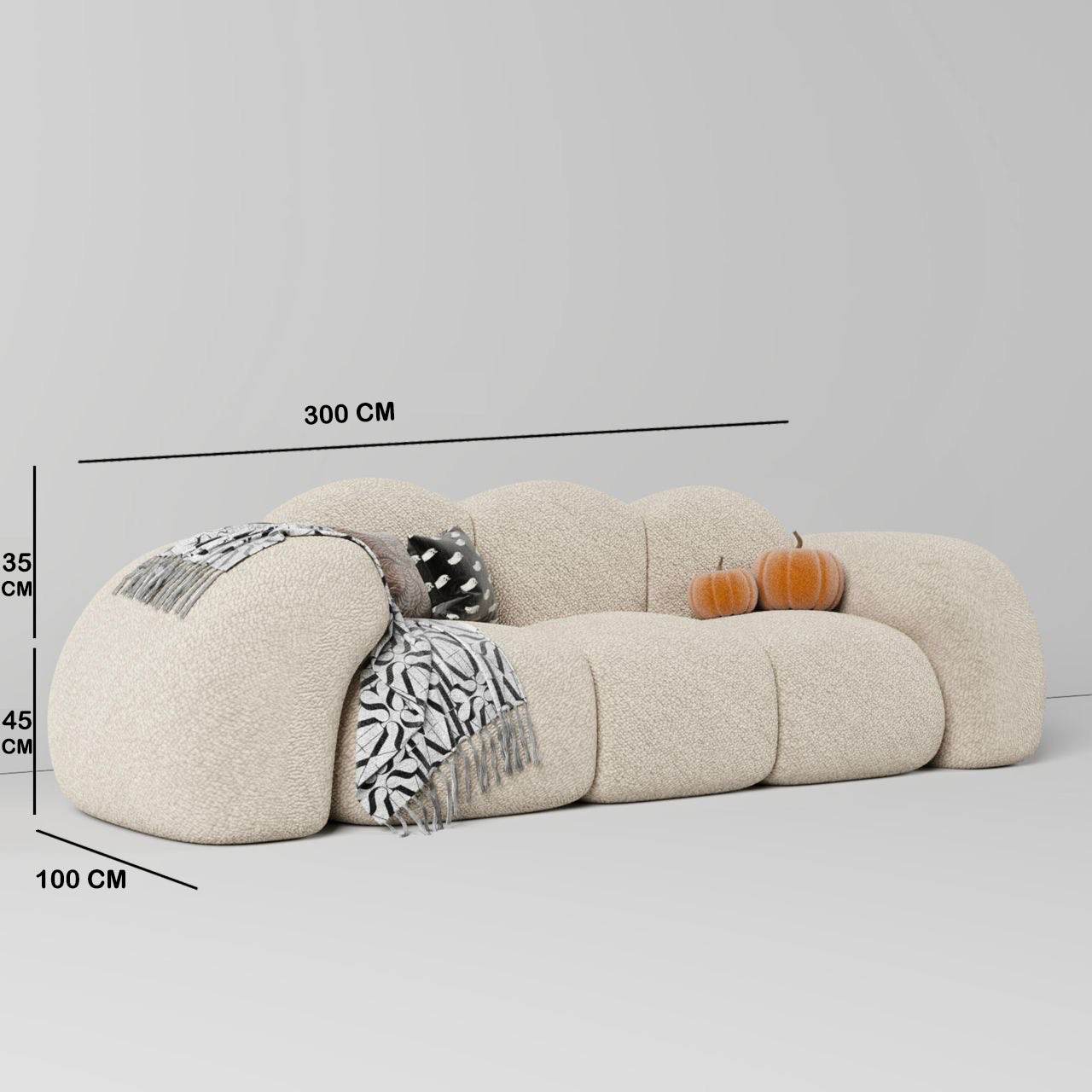 - 3 Seater Sofa Overall Dimensions : 300 W x 100 D x 80 H CM
