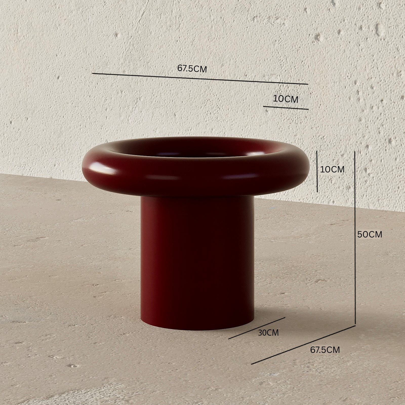 The Donut Side Table is a bold and contemporary accent piece with a distinctive rounded design. Featuring a deep burgundy finish, its smooth circular top seamlessly flows into a cylindrical base, offering a modern sculptural aesthetic. Perfect for adding a pop of color and functionality to living spaces.