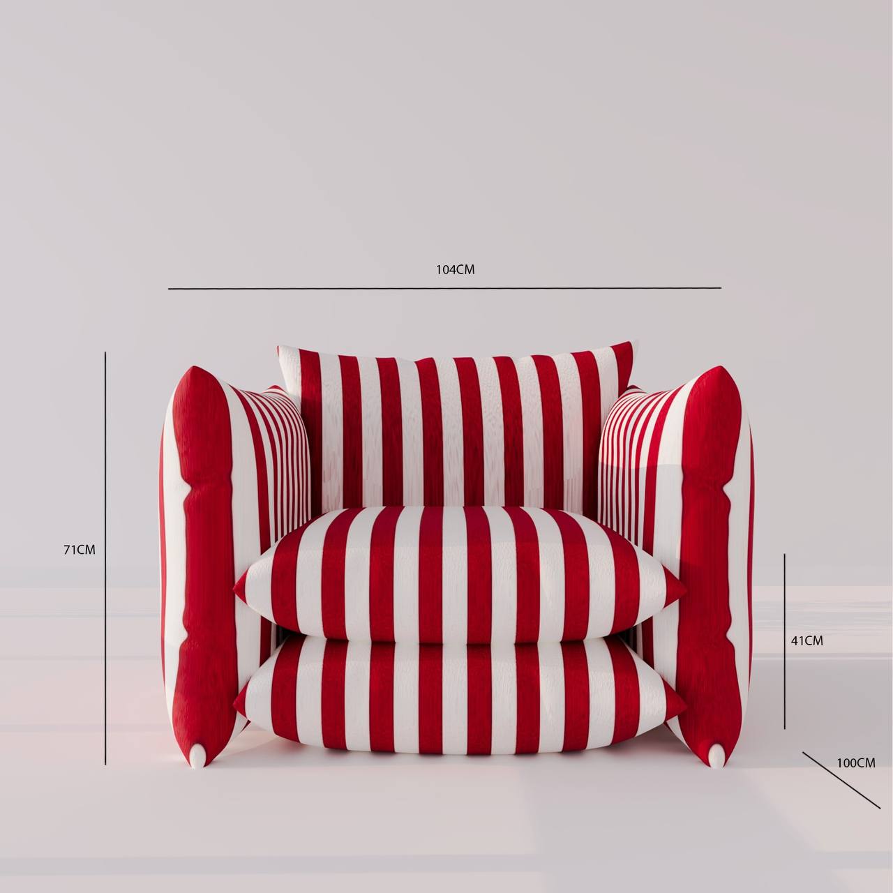 Indulge in the comfort of our Pillows Armchair in stripped white & red / white & black satin. With its unique design resembling pillows, it invites you to relax and unwind. The modern and exclusive color combination adds a touch of elegance to any room. Experience ultimate relaxation and style with our armchair.