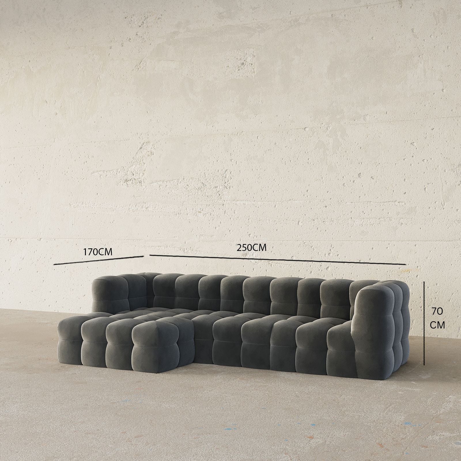 The Veyron sofa is a perfect choice for any living room as it boasts comfort, a unique shape, and can fit seamlessly into various arrangements. Available in blue and grey, its quilted cover adds to its plush filling and inviting appearance.