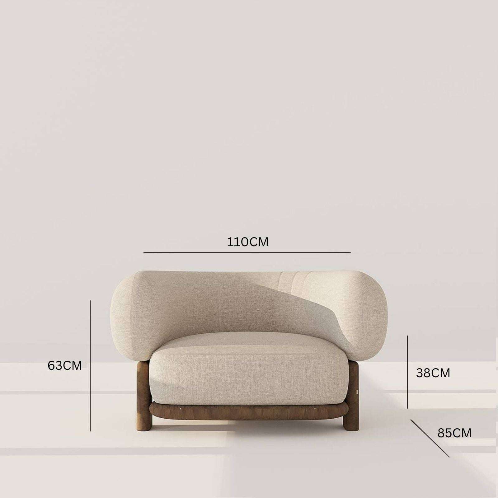 Elevate your space with the modern elegance of the Elba Armchair. Crafted with premium beige linen and three walnut legs, this one-of-a-kind piece features a curved backrest and connected u-shaped arms for utmost comfort and style. Perfect for any contemporary room, add a touch of sophistication with this armchair.