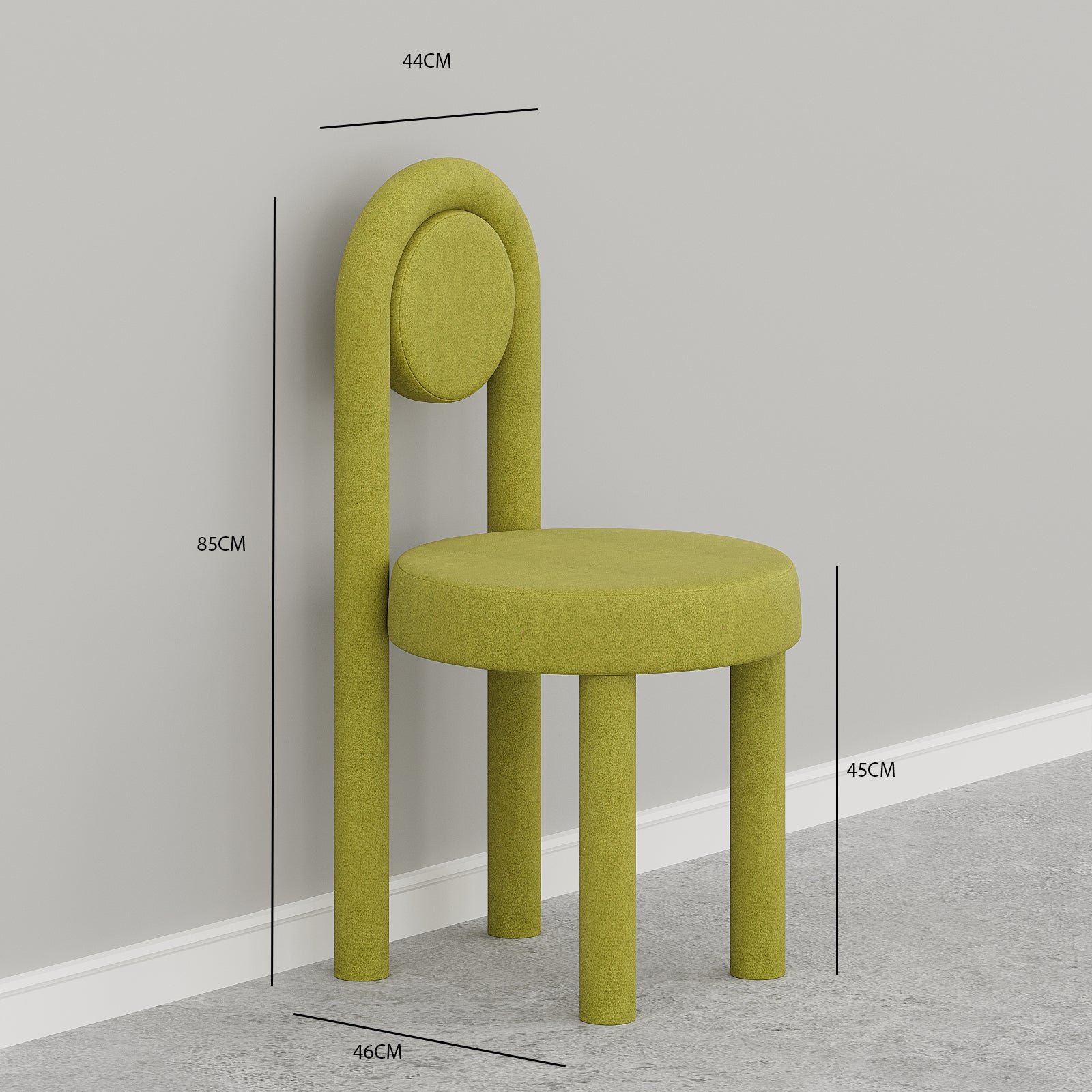 Elevate your space with our Lulu Chair / Spring, crafted with luxurious multi-colored matt velvet. Choose from an array of pop-color shades including red purple, baby pink, lime, and orange. This modern armless chair features a unique semicircular shape and arched backrest, supported by four rounded legs. Perfect for adding a pop of color to any room, or as a playful addition to your dining space.