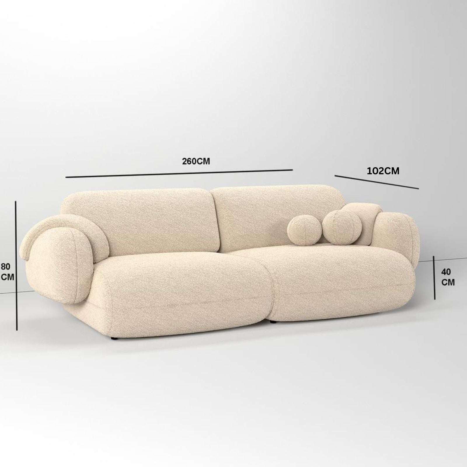 Introducing the Seasons Sofa 3S in Premium Beige Boucle. This modern sofa boasts conjoined arms, adding a touch of elegance and comfort to any home. Experience luxury and style with this beautiful and sophisticated piece.