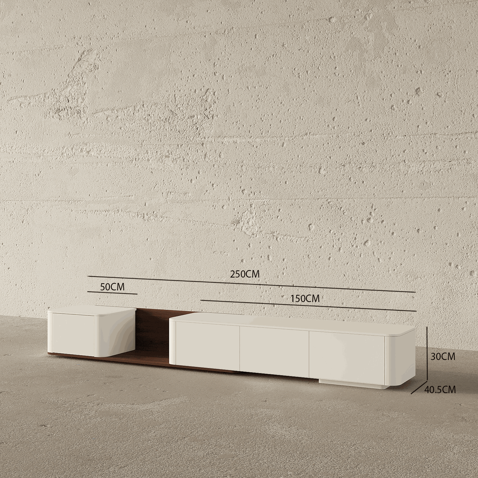 Elevate your living room with the Imani Extendable TV Unit. Crafted with off-white , white & walnut veneer and a sleek, round edge design for protection against scratches. Its versatile, free-moving feature allows for seamless placement. Save space with four drawers. A modern must-have for any sophisticated living space.