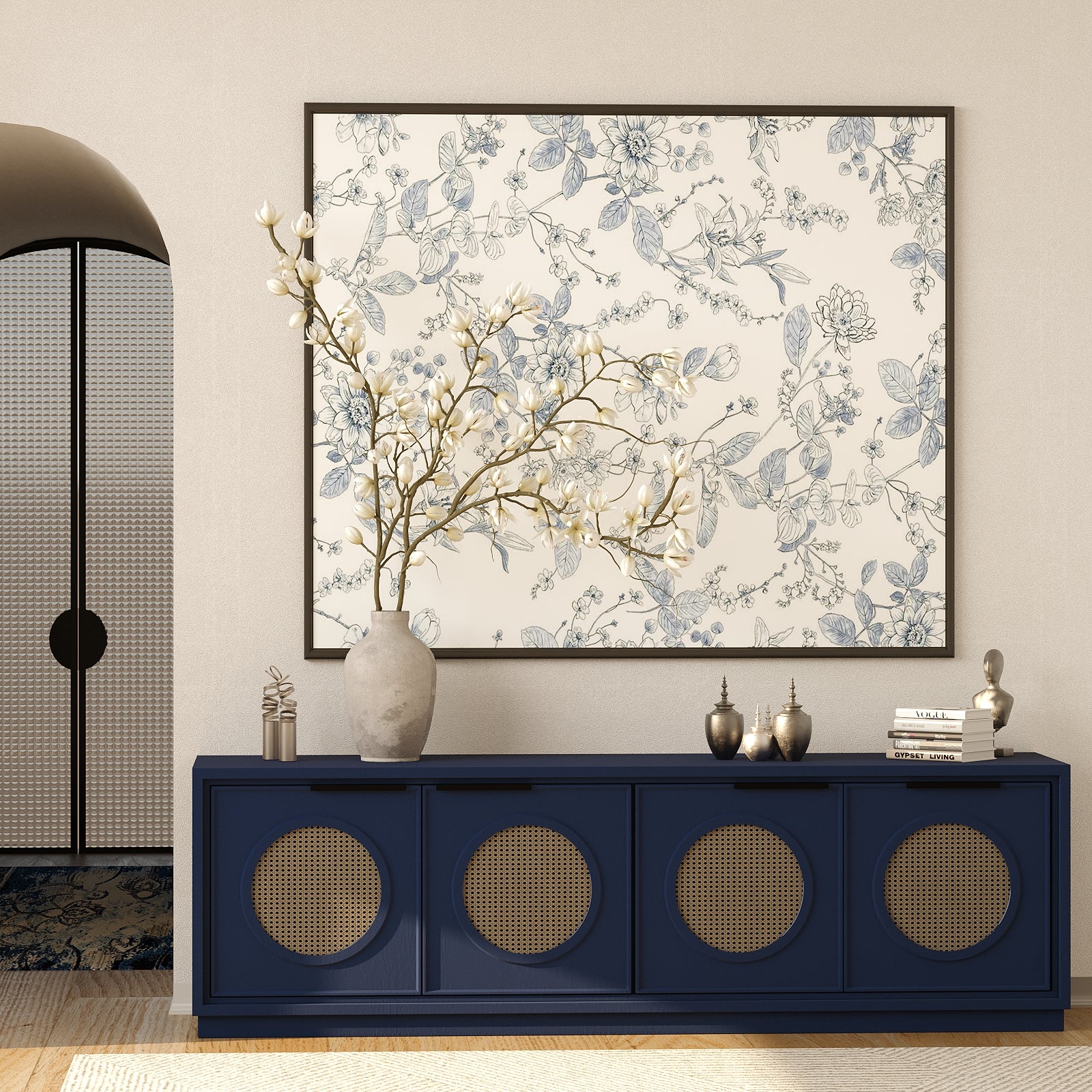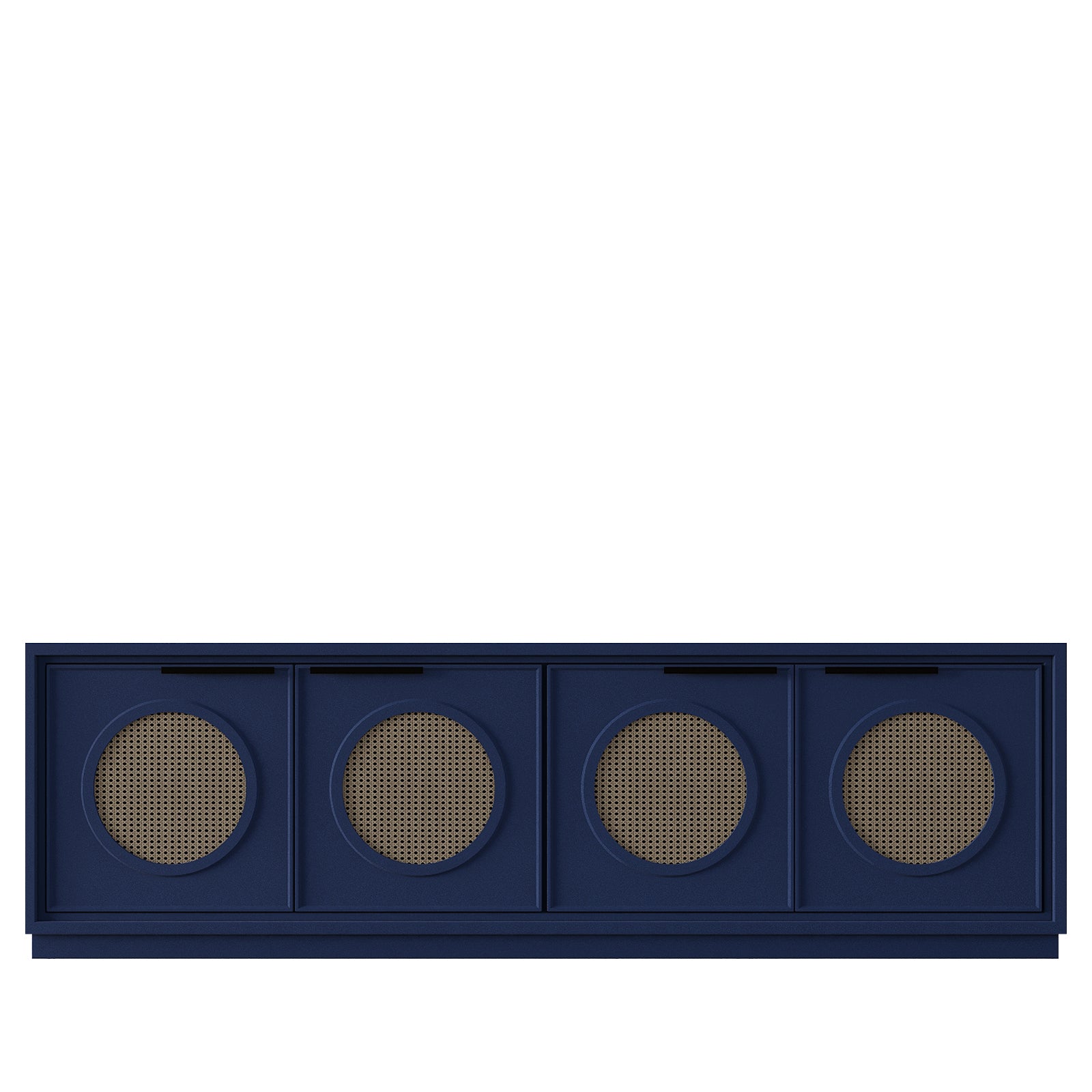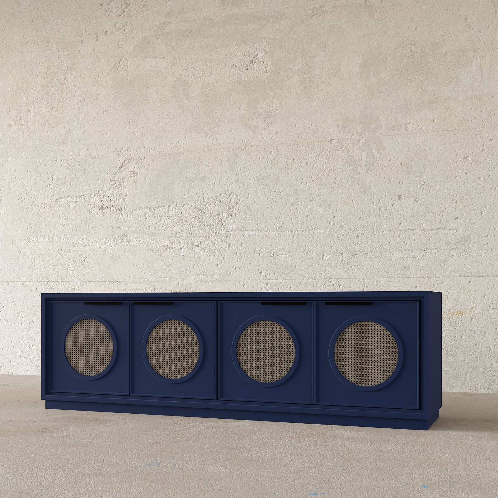 The Circle Buffet is a striking and functional piece that brings a bold yet elegant statement to any dining room or living space. Crafted from durable MDF wood and finished in a rich navy blue paint, this buffet features four doors, each adorned with unique circular cutouts showcasing intricate rattan webbings. The design is completed with integrated handles, maintaining its sleek and seamless aesthetic.