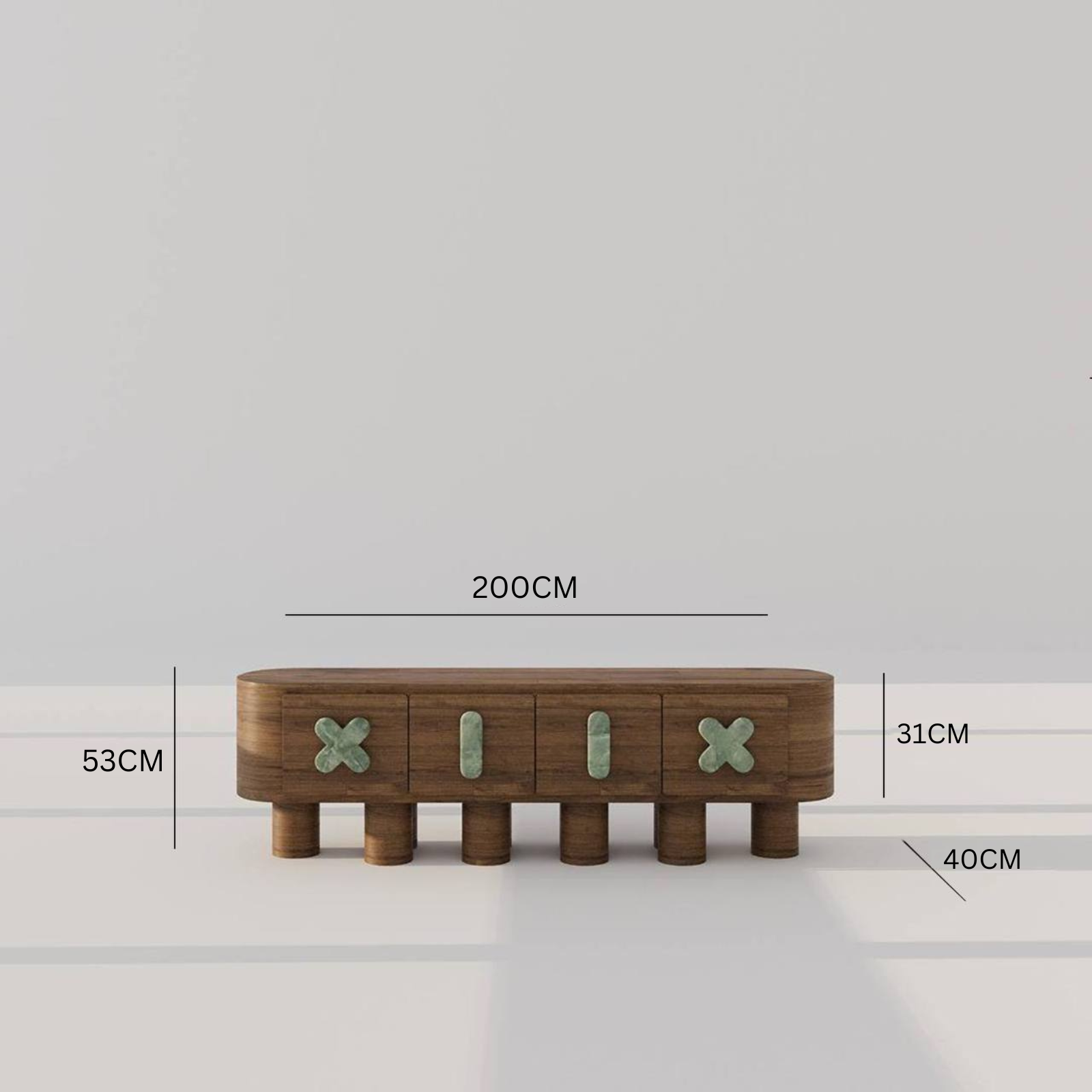 Elevate your living space with the XO TV Unit, a modern and luxurious addition to any room. Crafted from MDF in Charcoal or African Teak finish, this unit features four doors for ample storage and a unique marble veneer handle in the shape of X-I. With ten O legs that set it apart from any other stands in the market, this TV unit adds will be the unique centerpiece of your home.