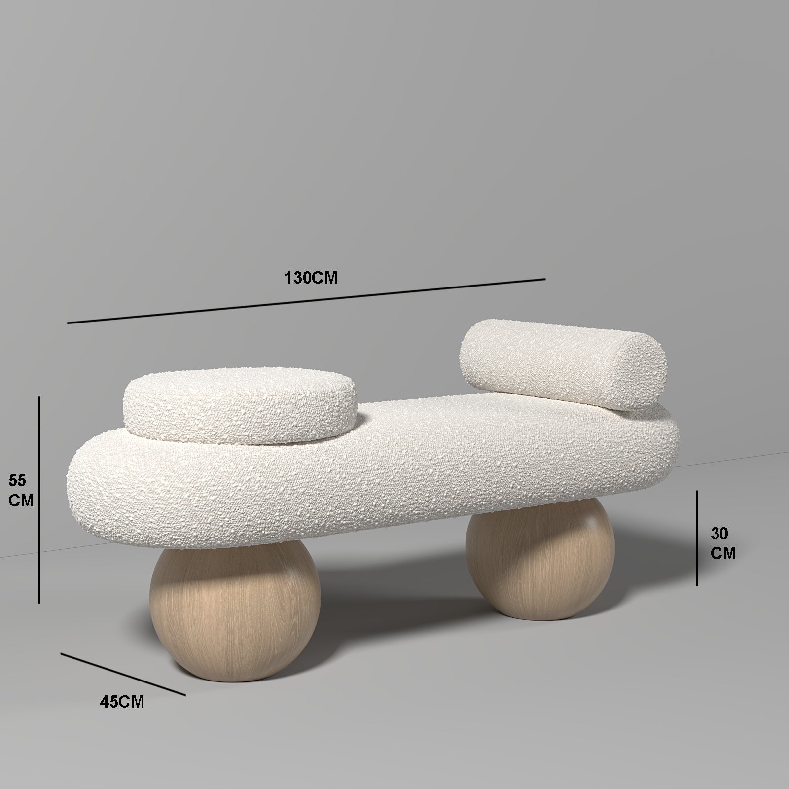 Introducing Spherea Bench in white boucle, featuring one arm and two spherical wood legs. This modern and elegant piece is not only a stunning addition to any interior, but also provides superior comfort.