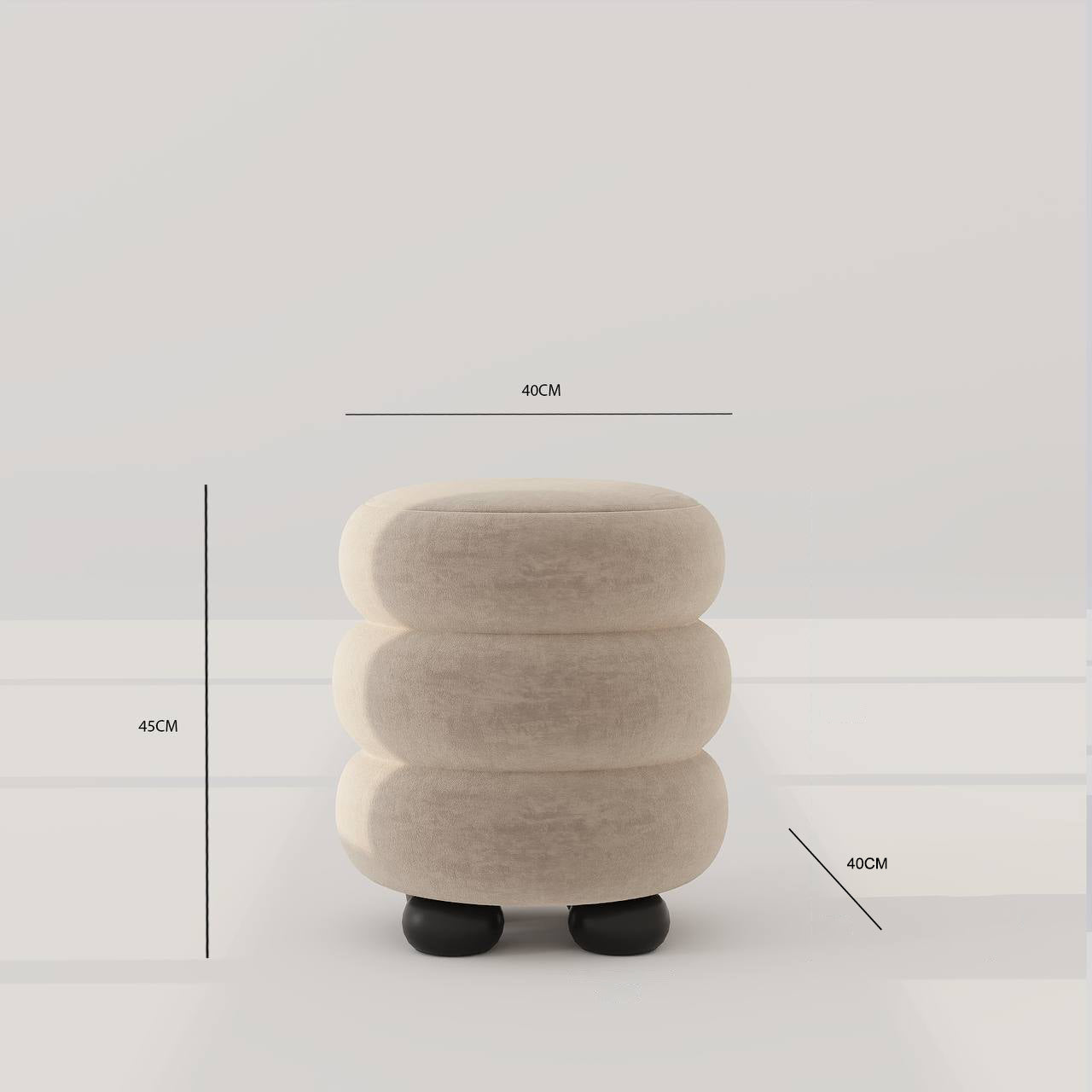 Elevate your space with our Tula Stool in luxurious matt beige velvet. Three stacked circles rest upon four spherical wooden legs, creating a modern and armless design. Perfect for any elegant bedroom. Indulge in premium style and comfort with this sophisticated piece.