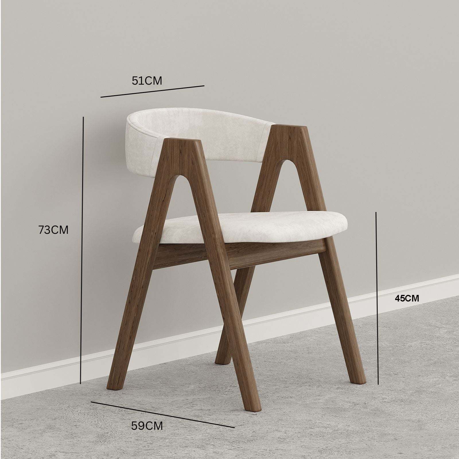 Introducing the luxurious Gubi Dining Chair. Adorned in premium white suede upholstery with walnut v-shaped legs, Its curved backrest and sophisticated design make it the perfect for any dining room, it combines style and comfort to elevate your dining experience.