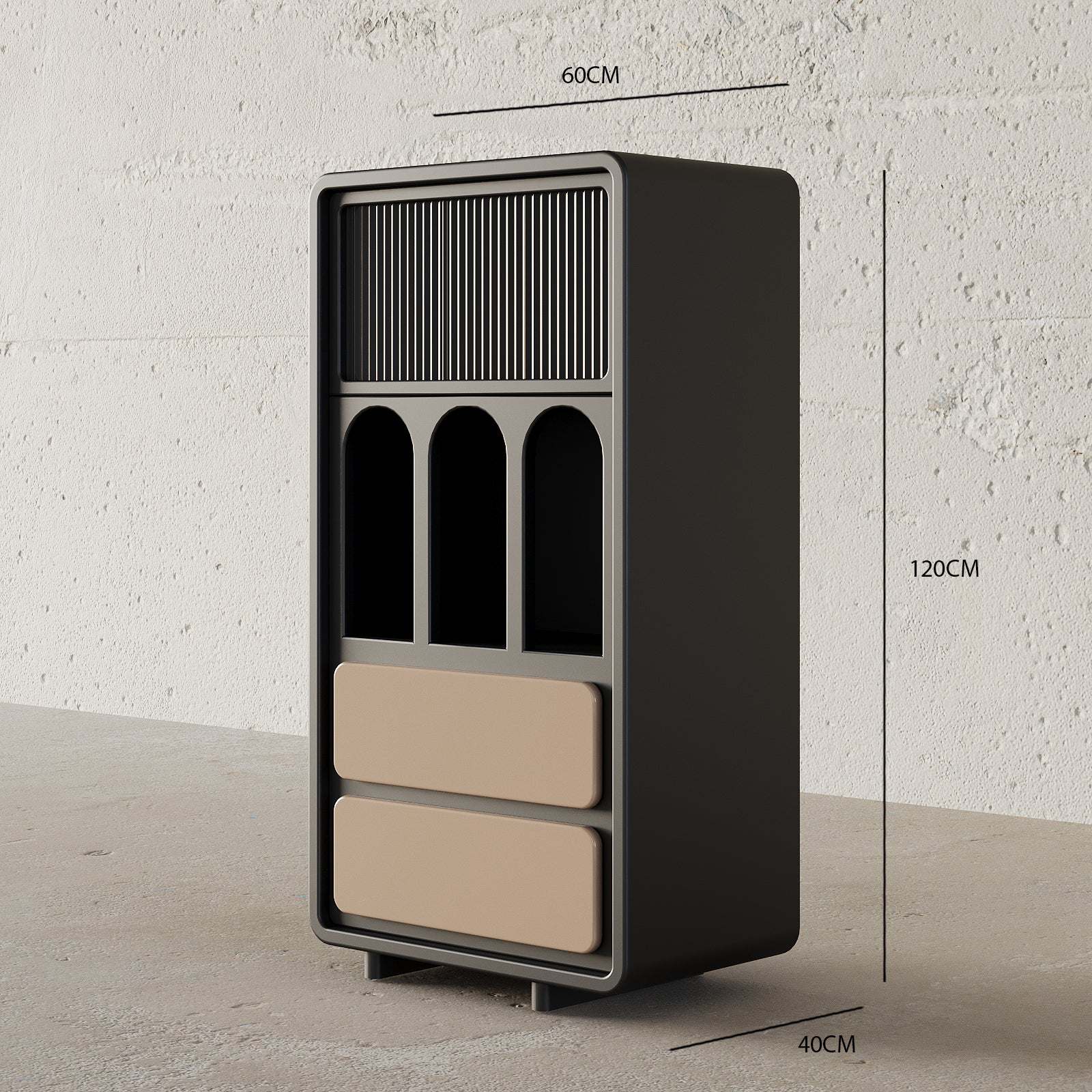 Introduce elegance to your living space with Roche Book Case. This modern piece boasts a sleek black and beige design with an acrylic door, open shelving, two drawers, and two sturdy legs. Perfect for any modern home, its arched shape and ample storage make for a sophisticated addition to your decor.