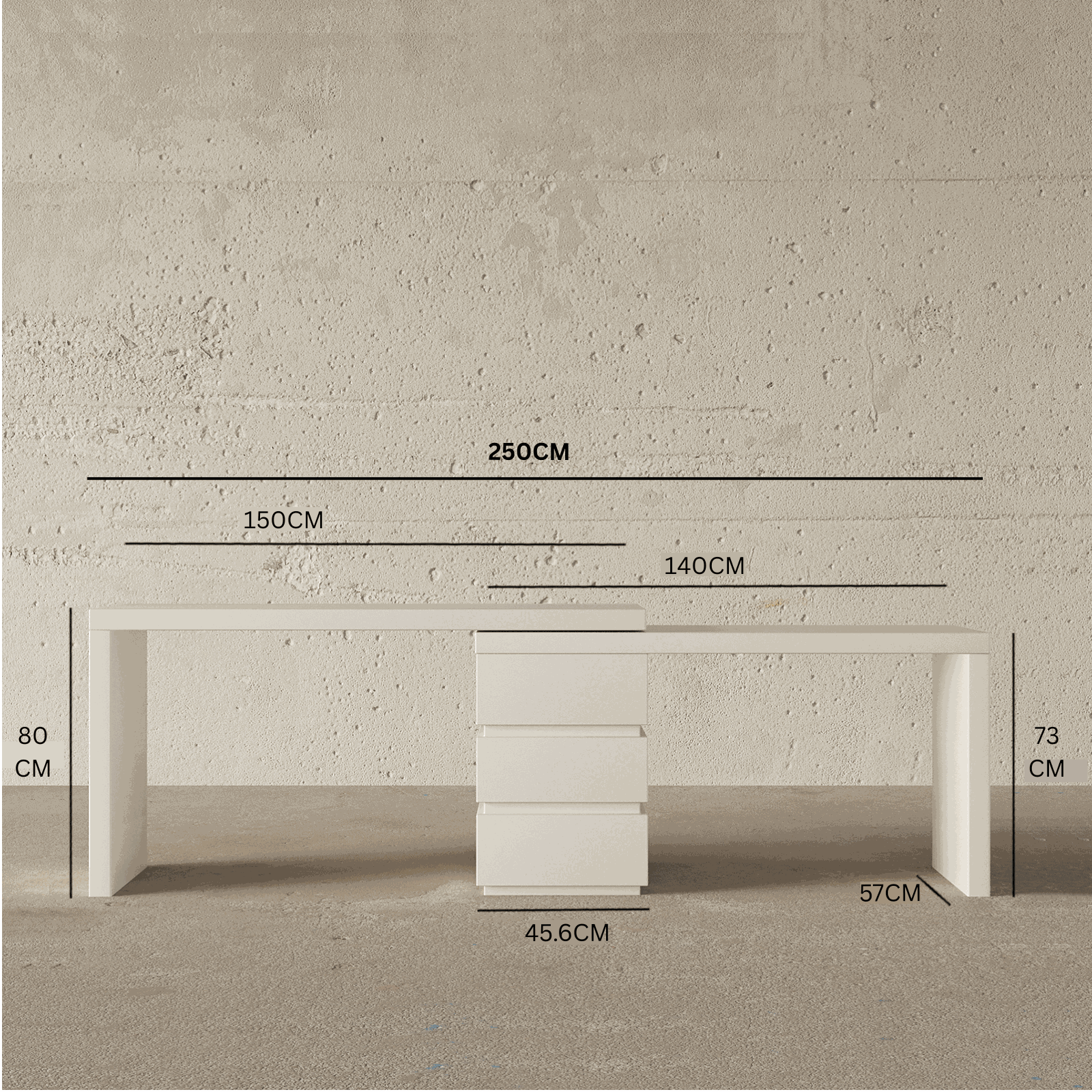 Upgrade your office space with the Valentina Office Desk in sleek white. Its modern L-shape design offers versatility, with two tables of varying heights that can be adjusted for optimal surface area. Perfect for collaborative work, the desk also boasts three drawers for ample storage. Elevate your workspace today.