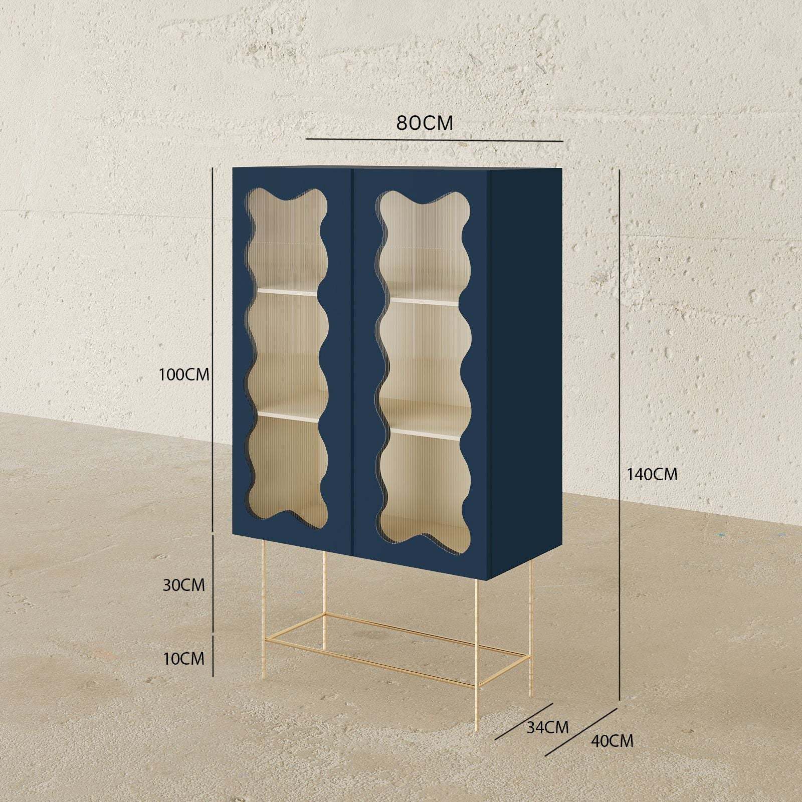 The Yale Cabinet is a stylish and functional piece that adds a touch of modern flair to any space. Its sleek design features a teal painted wood frame, acrylic windows, and slender steel legs, creating a look that is both elegant and eye-catching.