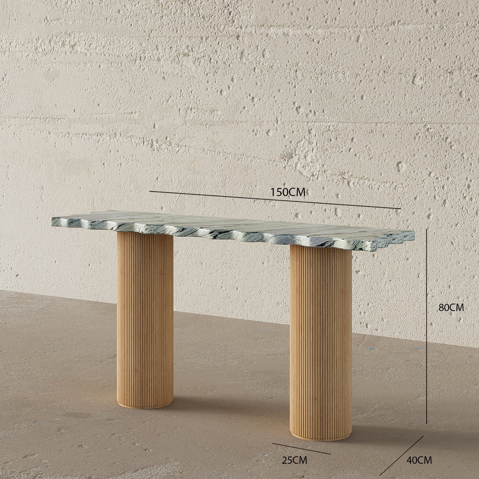 The Jesse Console Table features a statement design with a scalloped, green marble top that mimics the organic flow of nature, paired with ribbed cylindrical wooden legs that exude a modern yet earthy charm. Its unique blend of textures and materials makes it a striking focal piece for an entryway or living space, combining artistic elegance with functionality.