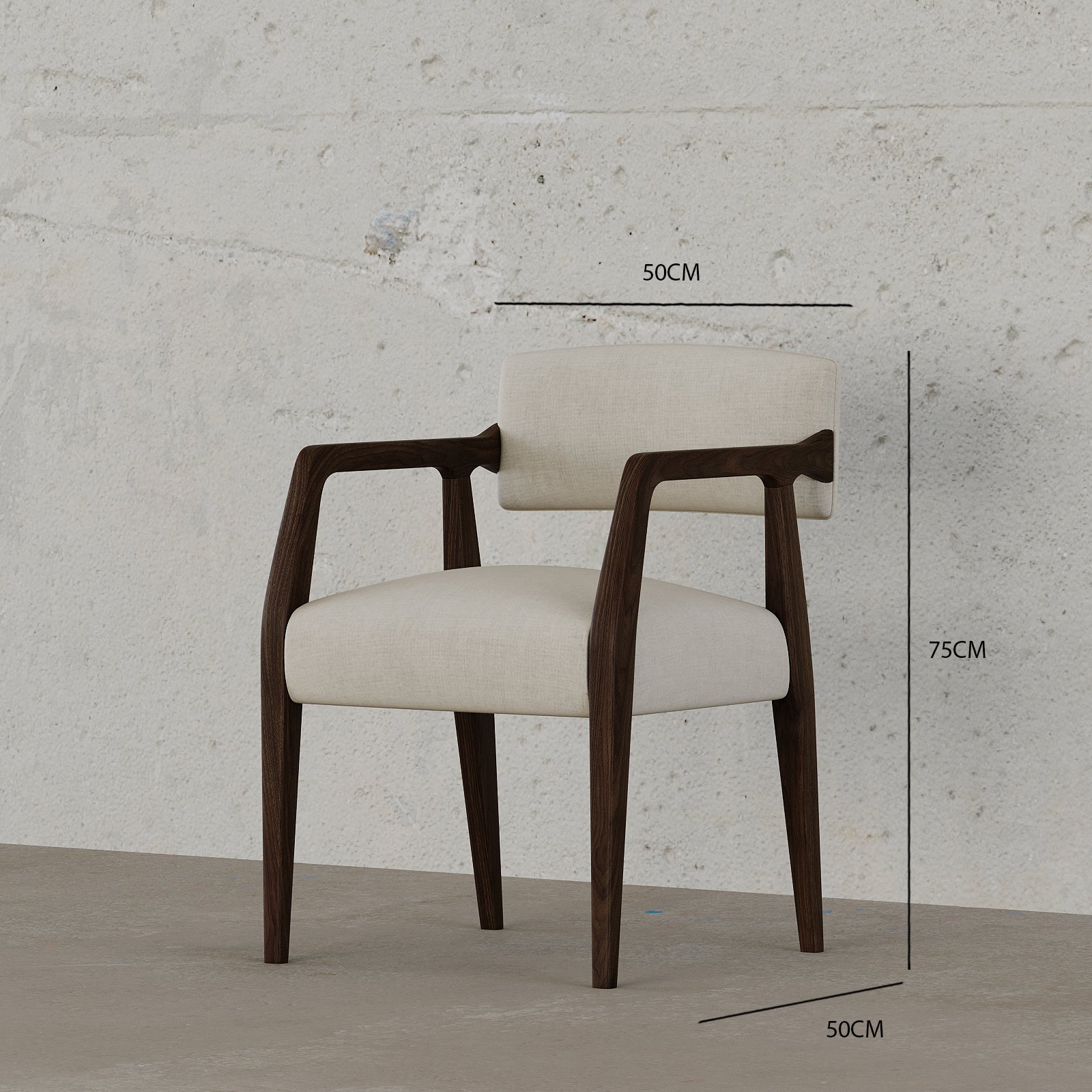 The Nexus Dining Armchair combines modern style with comfort. Its sturdy distressed walnut frame and soft cotton blend upholstery create a cozy and stylish seat for your dining area.