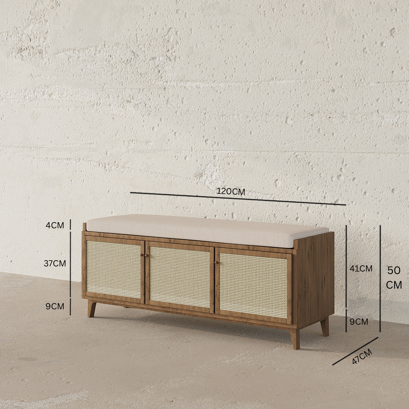 The Victor Shoe Storage Cabinet is a stylish and functional piece that adds a touch of warmth and texture to any entryway. Its unique design combines a MDF plus walnut veneer frame with woven rattan accents and a soft beige linen cushion, creating a look that is both inviting and sophisticated.