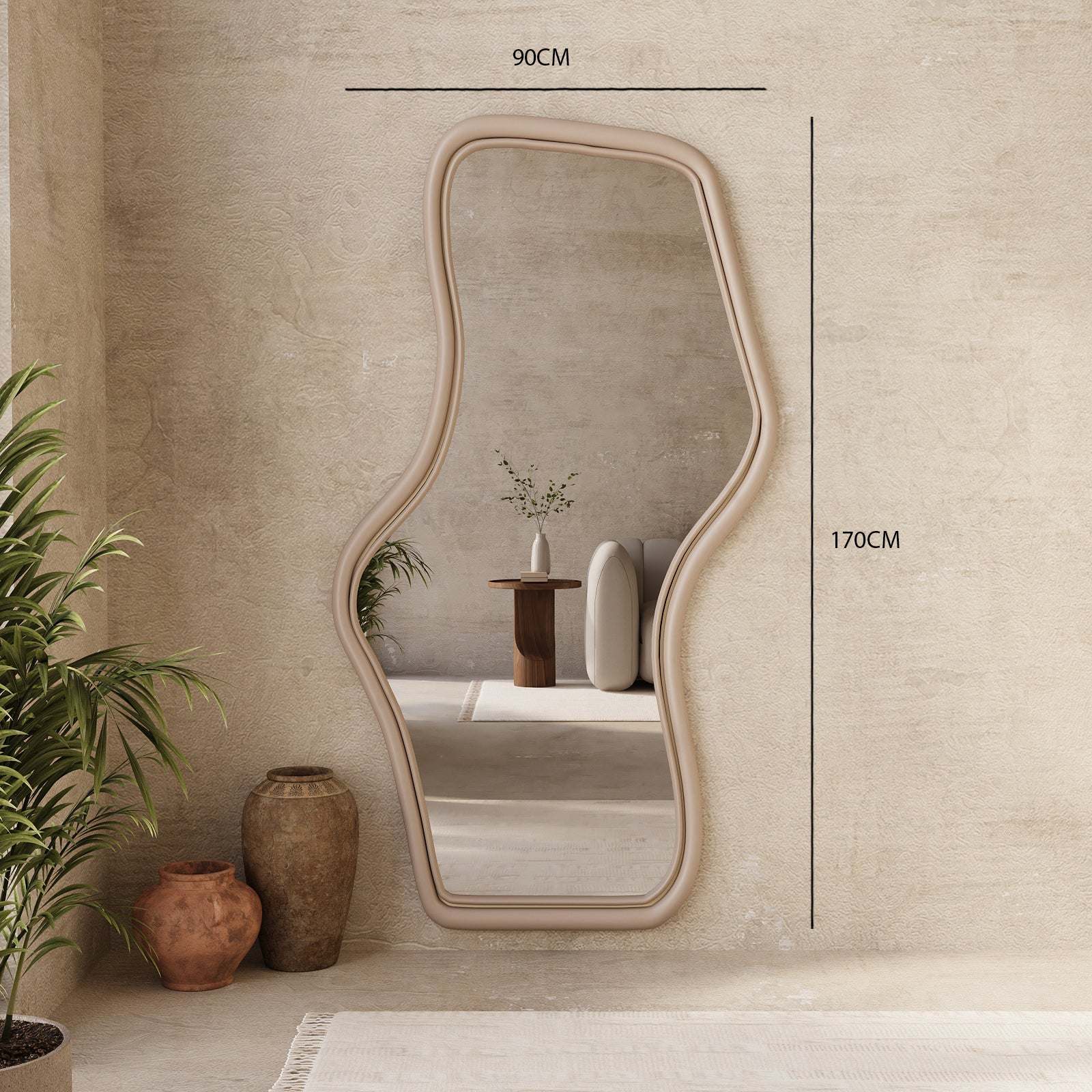 The Parla Mirror captivates with its distinctive irregular shape and full-length design. Smooth, curved MDF edges in an elegant matte finish frame this contemporary piece, delivering both practical functionality and artistic flair for any room in your home.