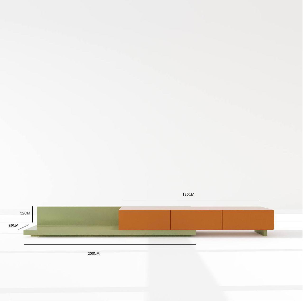 Introducing the Byren Extendable TV Unit in a vibrant orange and lime color, adding energy and vitality to your space. It is a modern-inspired piece that can be extended to fit extra-large TV screen. Featuring a clean-lined, it can accommodate many decor style. What's more, 3 solid wood drawers provide enough storage space.