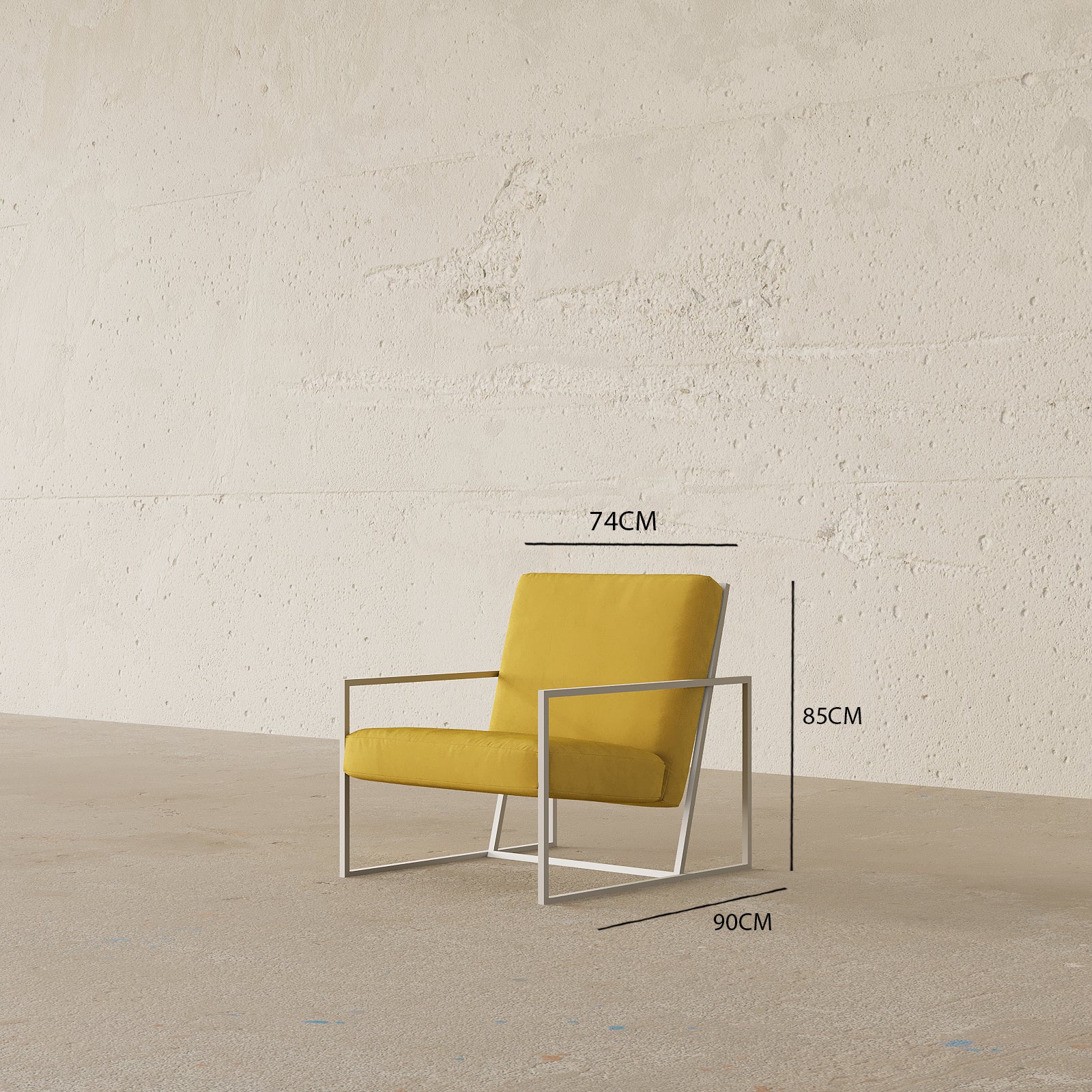 The Cleo Armchair exudes modern minimalism with its sleek, airy design and soft mustard velvet upholstery. Its geometric metal frame adds a bold touch and allows for seamless integration into various contemporary spaces. Perfect for adding a touch of understated elegance to any living room, reading nook, or bedroom.