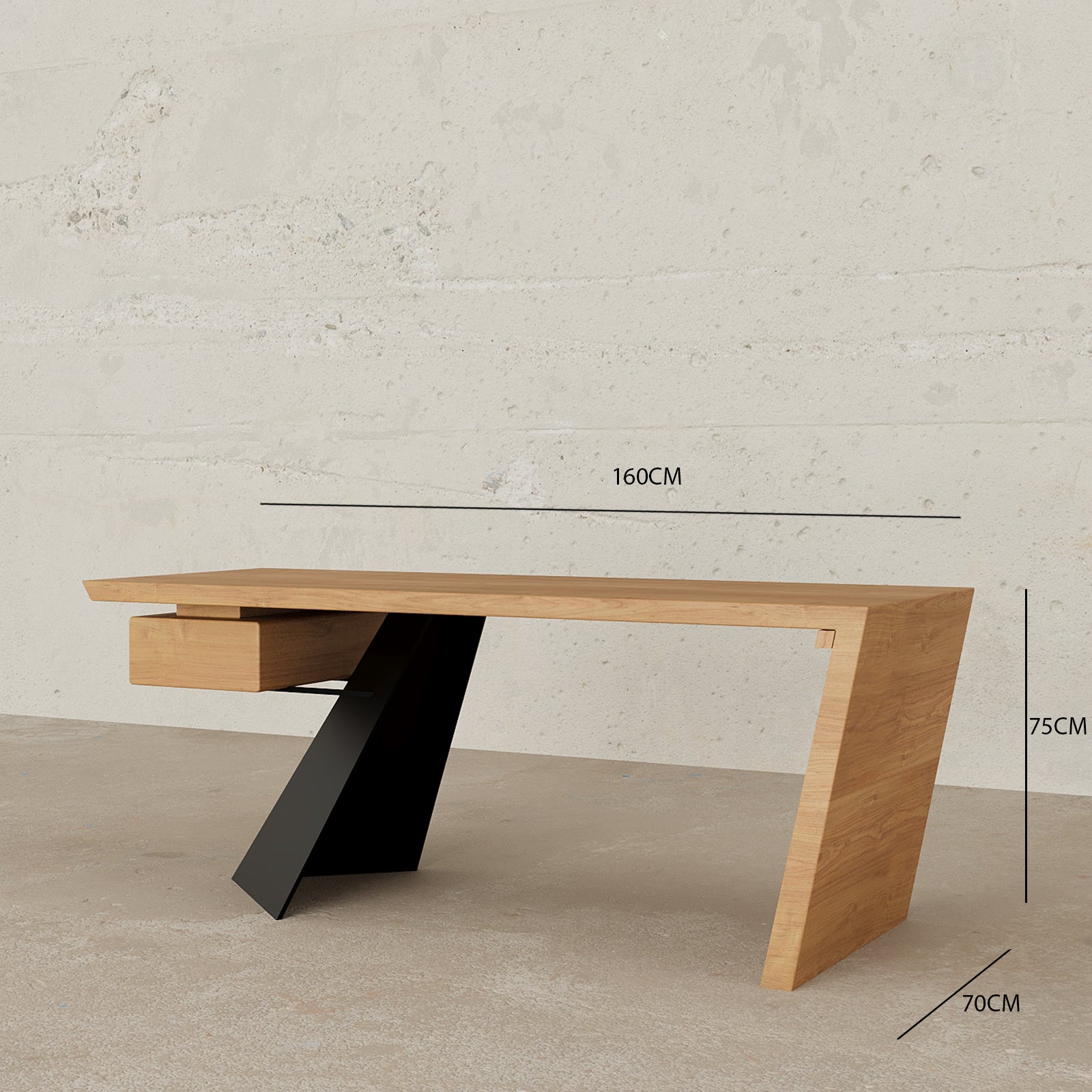 The magnificent accent desk, made of hardwood and wrought metal, combines nature-inspired design, soldering methods, and a handmade top that replicates the forms of log knots, reminding the user of the tree's past. Behind the roomy design's black surface is an elegant composition of two scaled hardwood supports, one with a floating drawer and one panel topped by a streamlined base.