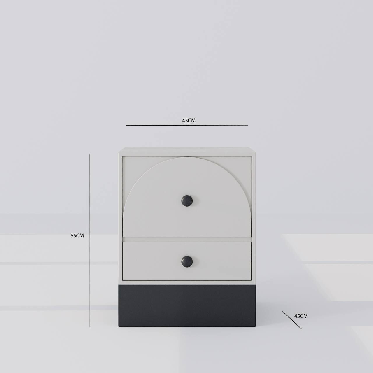 Create a modern and stylish bedroom with the Ramon Night Stand. With a white micro-plaster finish and black base, this nightstand adds a touch of luxury to any room. Featuring two drawers of varying heights, it offers ample storage while the sleek, black handle adds a sophisticated touch. Elevate your bedroom with this exclusive piece.