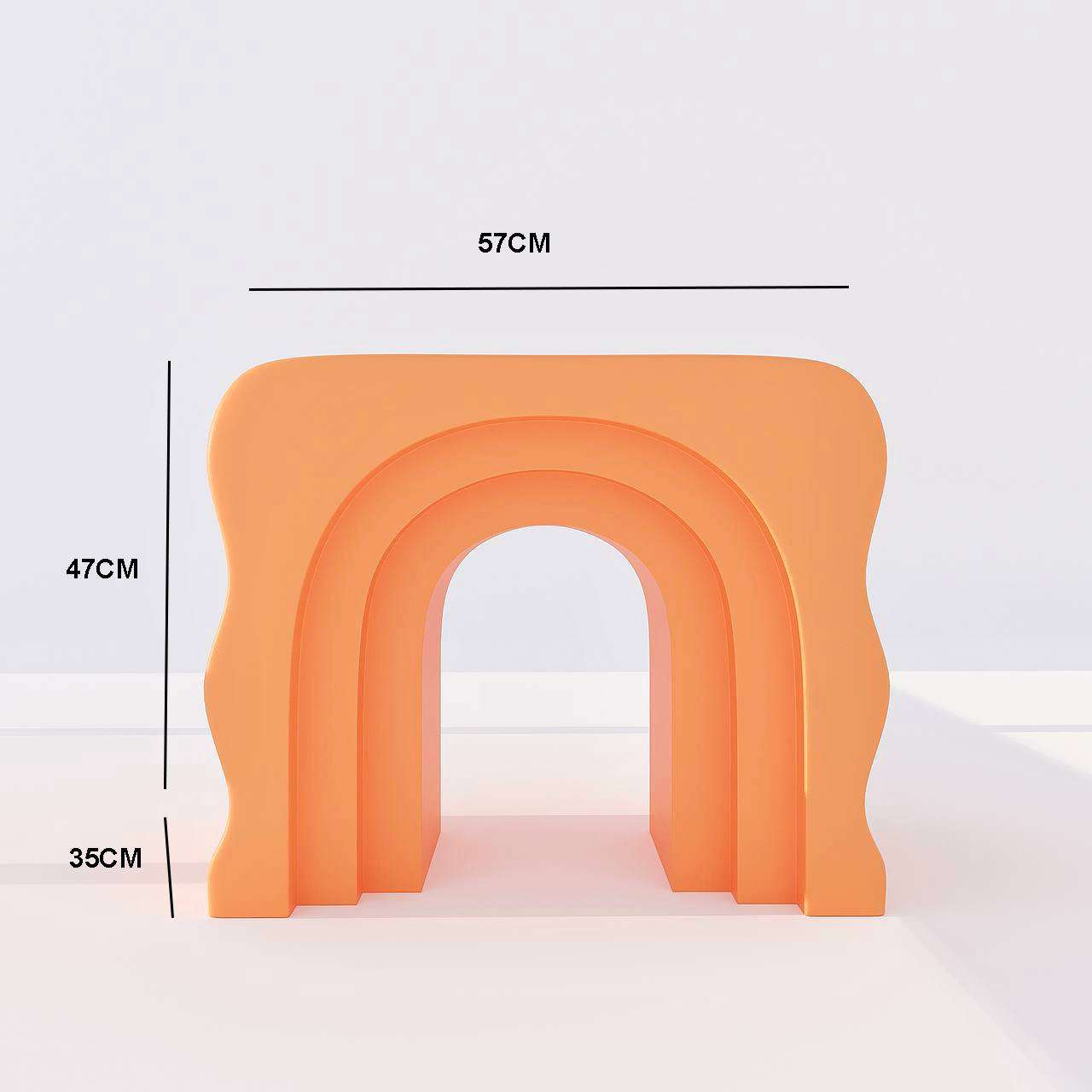 Introducing the sophisticated Drum Side Table, featuring a modern, Its bold orange, black color evokes a refreshing energy, bringing an exclusive spring vibe to your decor. with elegant waves adorning the arched base. Its unique design adds a touch of modern beauty to any room. Elevate your space with this exclusive piece.