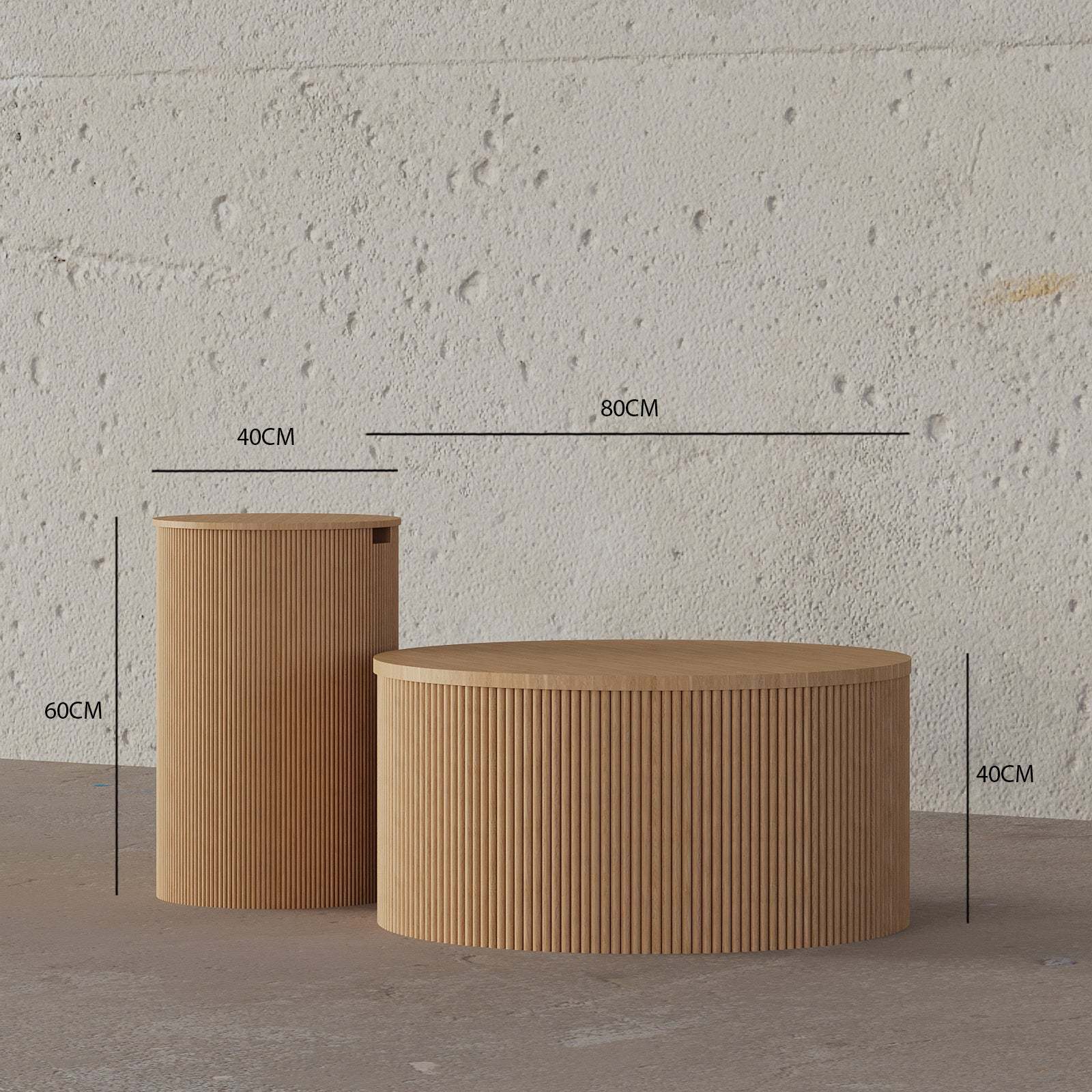 Elevate your living space with this sophisticated blend of two coffee tables, perfect for both contemporary and classic aesthetics. This exclusive set features a tall, slender table and a shorter, wider table, each boasting a luxurious wood base and a circular wooden top. Both tables also offer ample storage to safeguard your prized possessions.